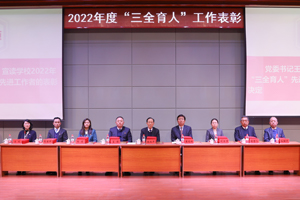 3月15日,学校2022年度“三全育人”工作表彰大会在学术报告厅举行。董事长张兆华、校长潘福林、党委书记王煊等学校领导班子成员出席了大会。大会由学校办公室主任张孝强主持。 会上,党委书记王煊宣读了学校《关于表彰2022年“三全育人”先进集体和先进工作者的决定》。 学校领导分别为“三全育人”先进集体代表和“三全育人”先进工作者颁奖。 信息工程学院院长吴琼、金融学院党总支书记陶微微代表“三全育人”先进工作者作了交流发言,后勤处处长刘磊、学生工作处处长庞旭代表“三全育人”先进集体作了交流发言。 学校各部门负责人、各学院院长、党总支书记、全校教职工代表参加大会。