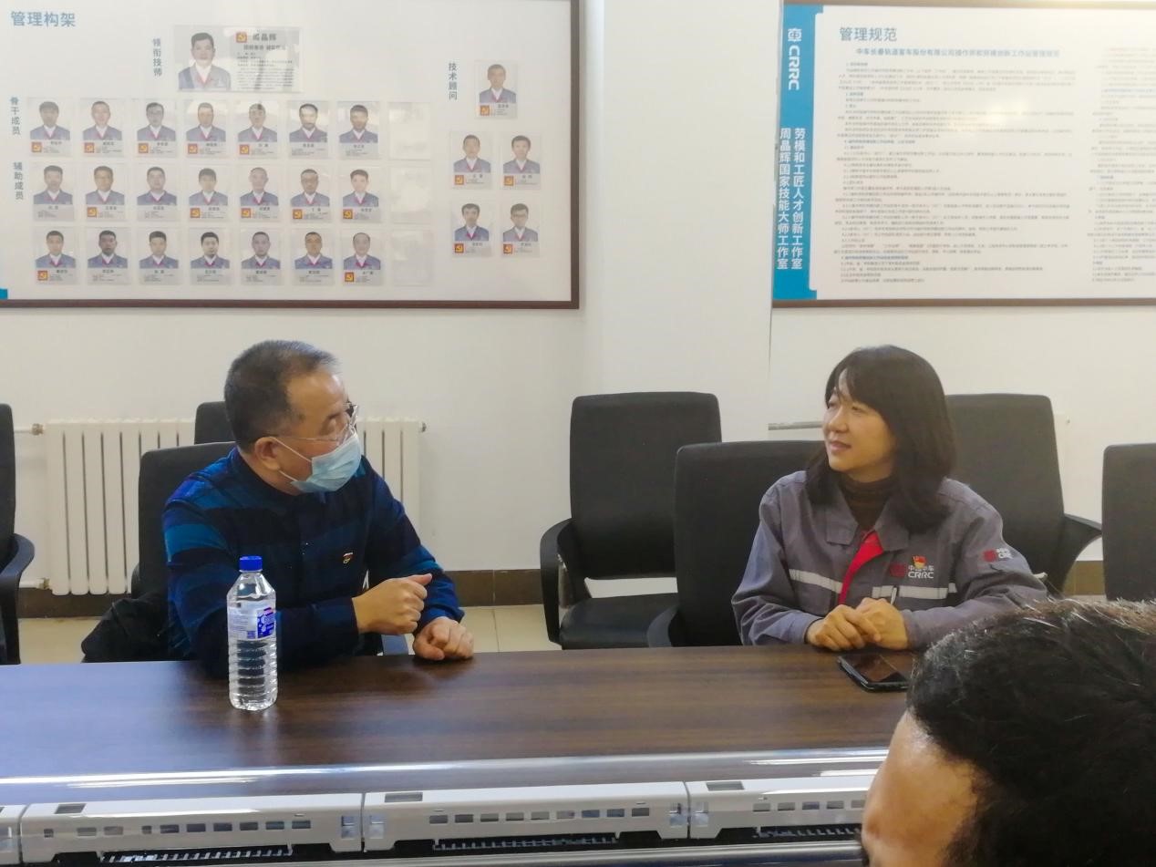 随后,机电工程学院教师与张丽丽书记和周大师共同参观了高技能人才墙、高铁先锋训练营,并观看了中车长客股份公司高速动车组制造中心装配车间宣传视频。