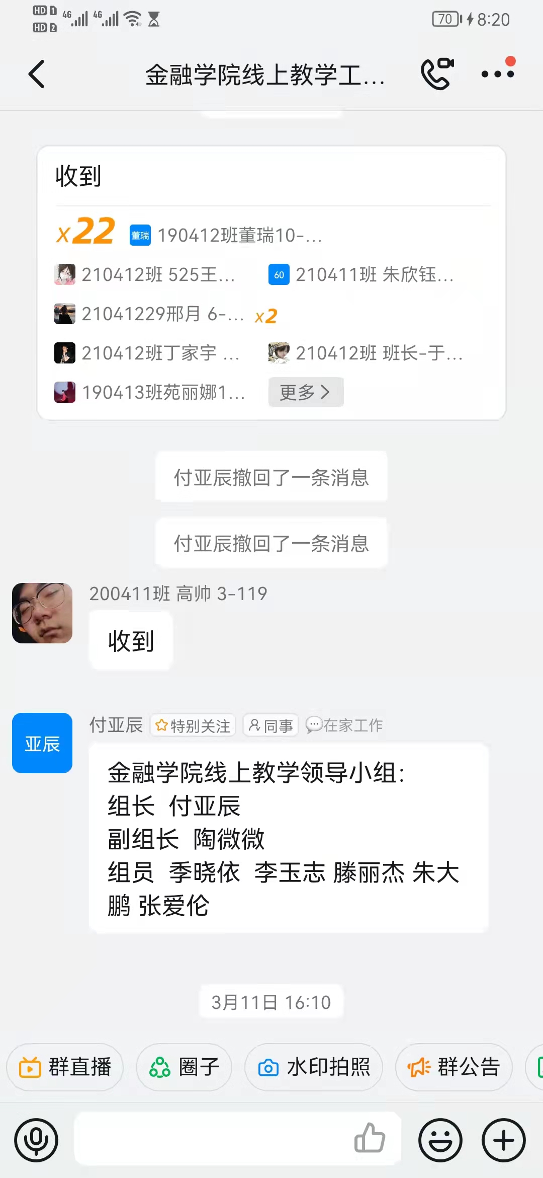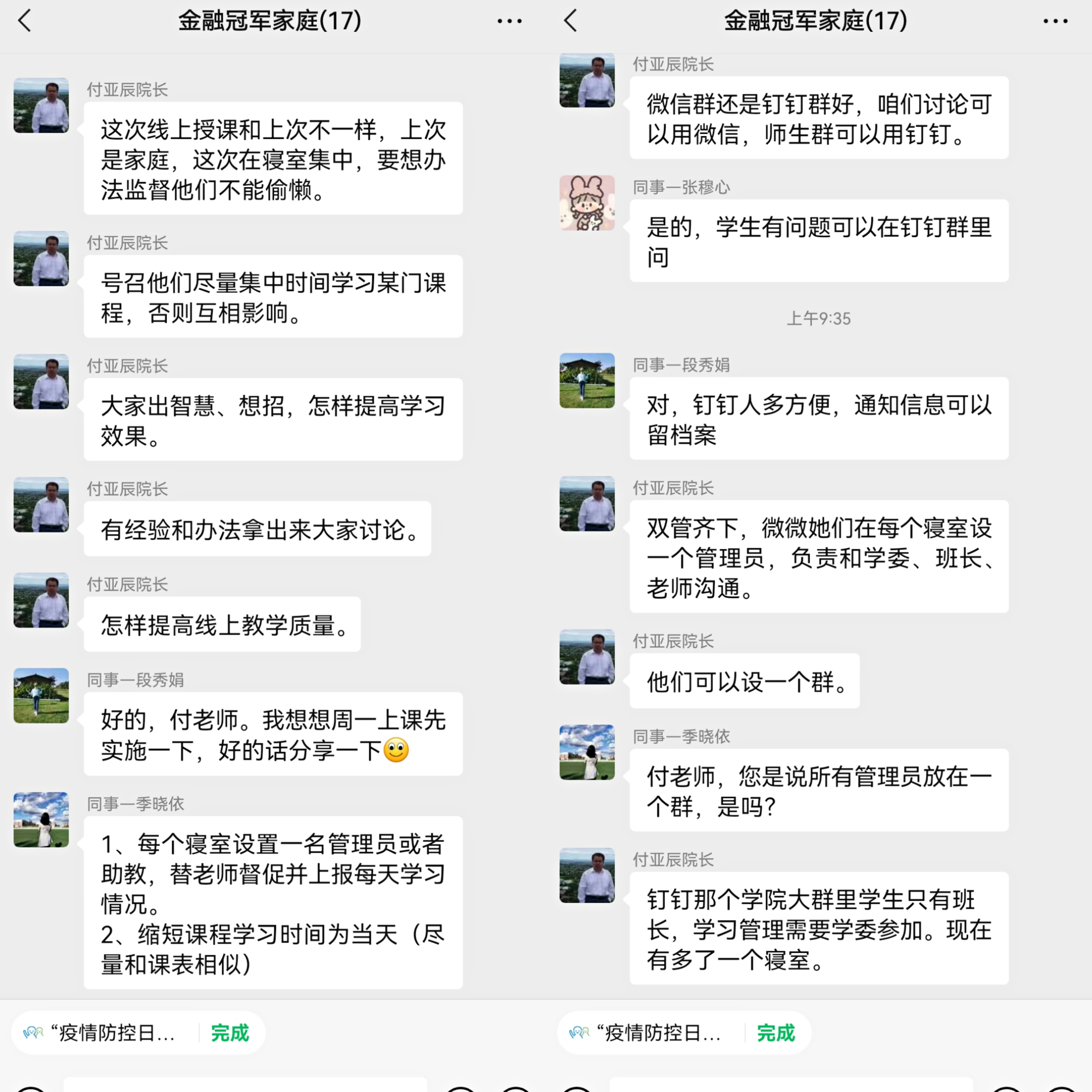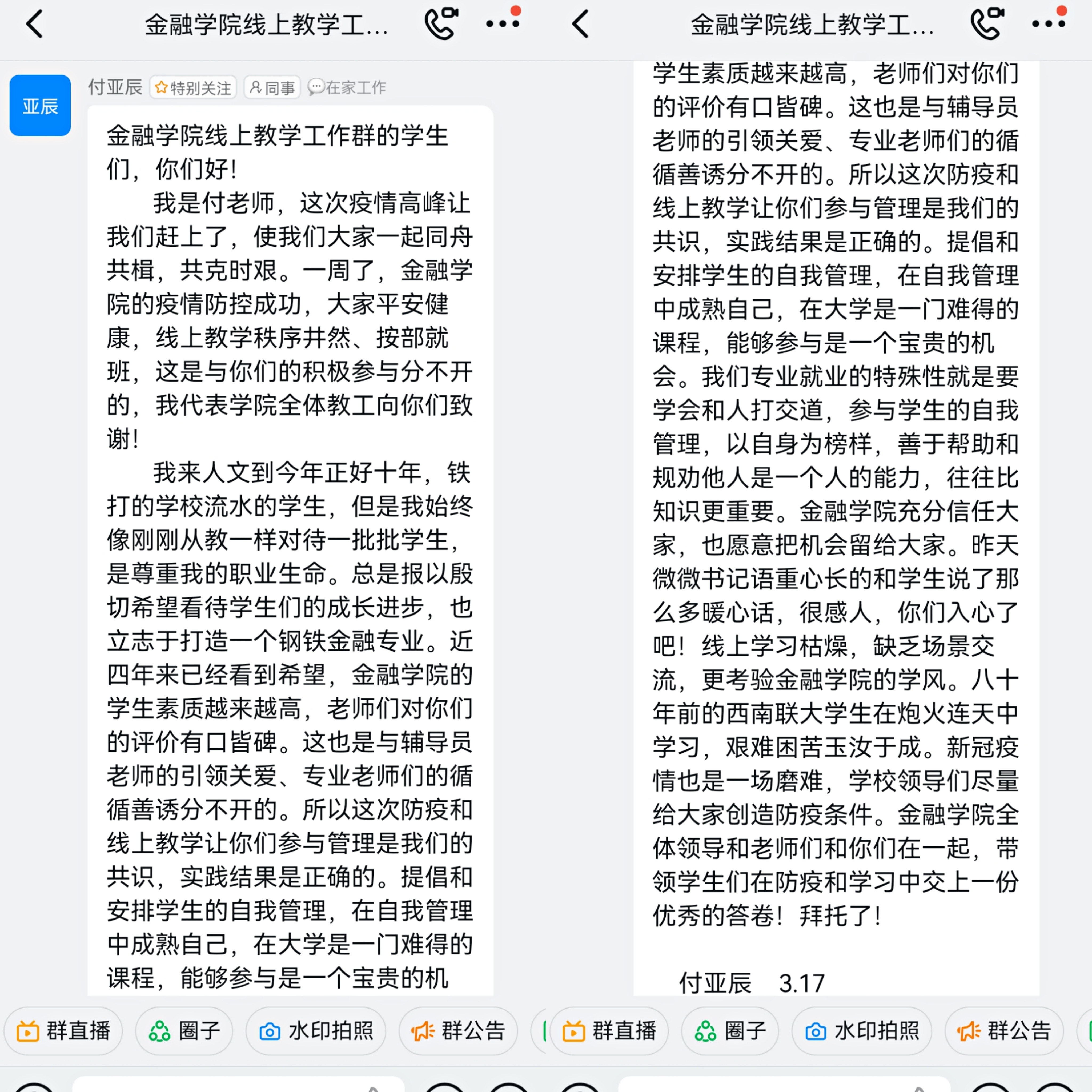 自学校启动线上教学后,金融学院院长付亚辰第一时间组织学院全体教师,线上学习《长春工业大学人文信息学院关于启动线上教学的通知》、《关于进一步做好疫情期间线上教学的指导意见》,认真学习文件精神为线上教学作充足准备。