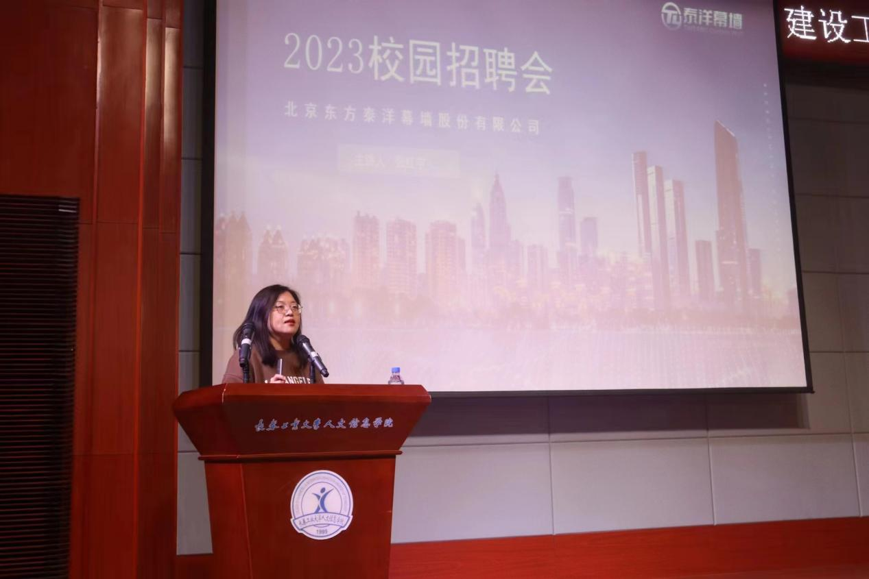 北京东方泰洋幕墙股份有限公司是一家集建筑幕墙、系统门窗、室内外装饰工程的产品开发、工程设计、加工制造、安装施工、售后服务为一体的专业化工程公司。公司总裁助理兼人力资源部部长张红宇女士介绍了公司的发展历程、企业文化、主营业务、未来发展规划、岗位需求等方面的内容,强烈地表达了对“学徒们”的渴求及期待,与企业共享发展机遇,共创美好未来。宣讲会结束后,我院学生积极投递简历,公司工作人员在现场进行了招聘面试。