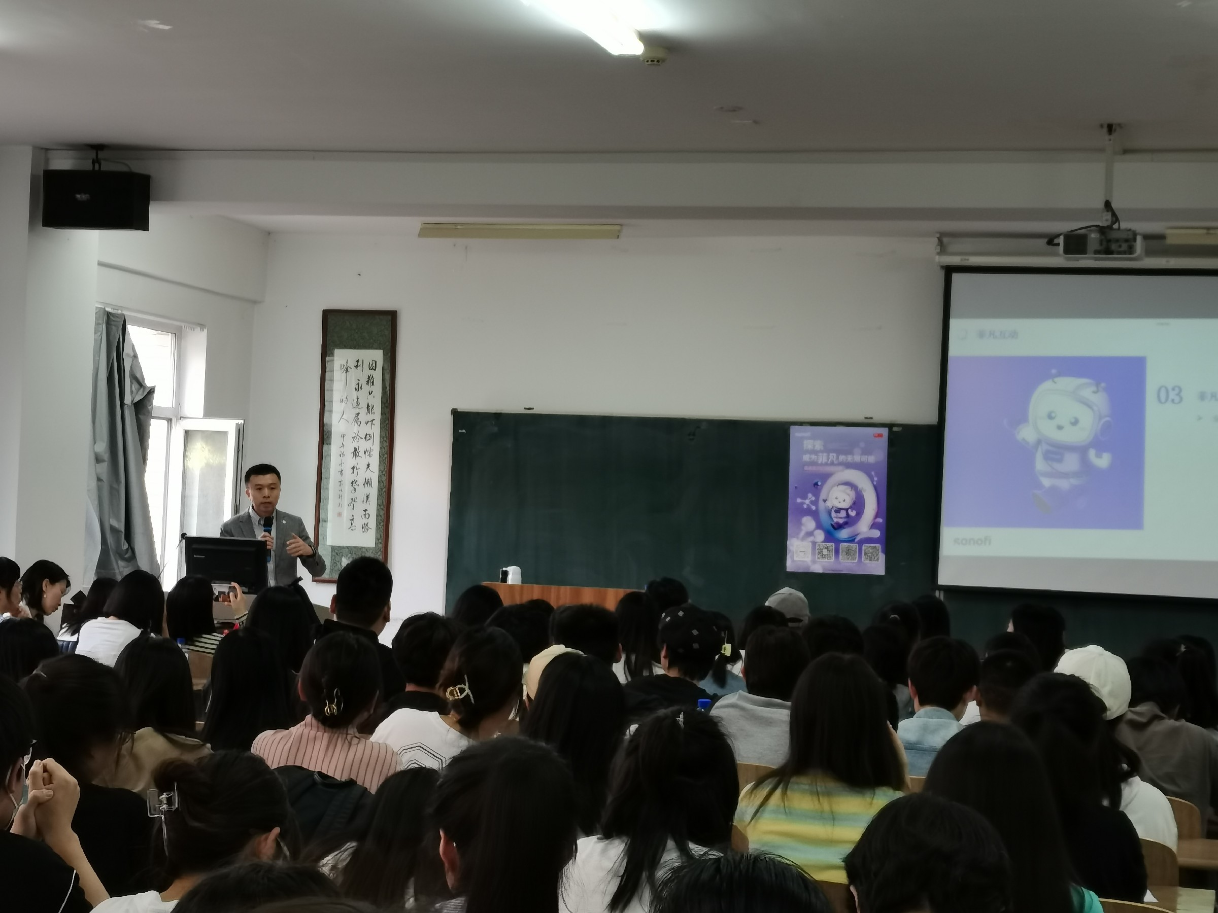 张爽讲出1885年路易.巴斯德研制出狂犬病疫苗及梅里厄家族用严格的科学精神使疫苗产业化发展的故事,让同学们真切感受到疫苗挽救生命的价值;张经理又举出2011年,赛诺菲巴斯德生产的儿童五联疫苗(吸附无细胞百白破脊髓灰质炎疫苗和b型流感嗜血杆菌(结合)联合疫苗)在中国上市的例子,让同学们重新认识到疫苗的经济价值,这种五联疫苗,一次接种可同时预防5种疾病,简化免疫程序,同学们对公司疫苗部取得的成绩赞不绝口。