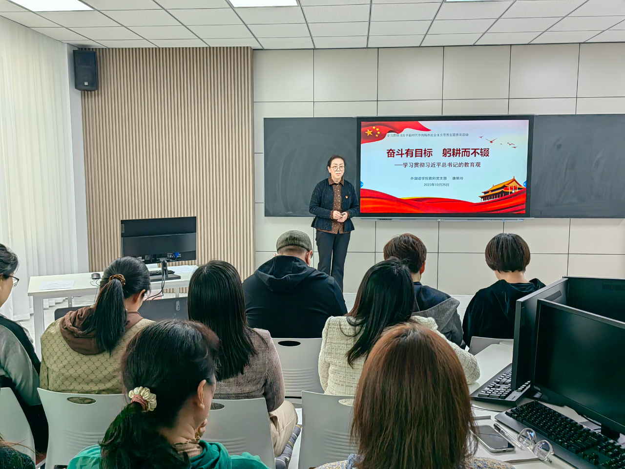 外国语学院院长唐艳玲以“奋斗有目标 躬耕而不辍-学习贯彻习近平总书记的教育观”为题做了一场生动的党课。首先唐艳玲院长介绍了教育观涵义和习近平总书记的教育观,然后着重阐述如何理解贯彻落实习近平总书记的教育观,最后提出对广大教师的建议和要求,要爱岗敬业,守初心,初心是师德的重要基础,有爱心,爱心是育人的最好诠释,进取心是具体行动落实。要做三好教师:备好课、上好课、育好人,严爱相济润己泽人。
