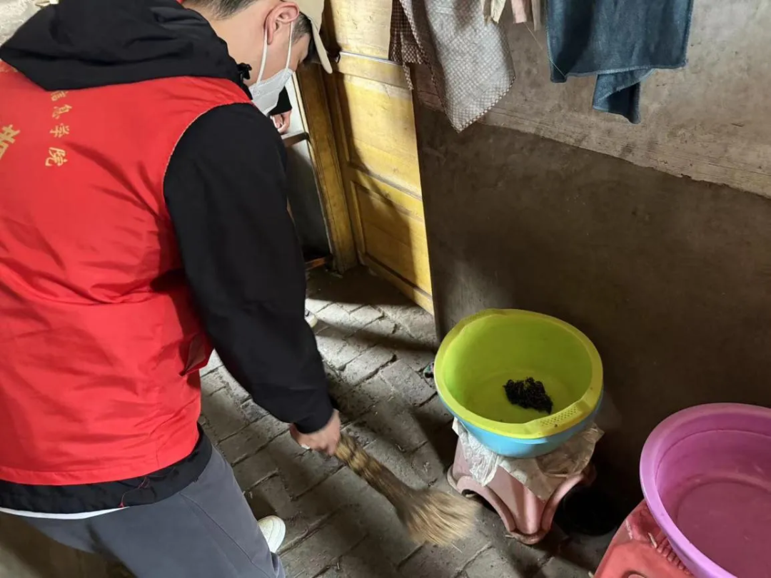 王奶奶一家,全家无主要劳动力,丈夫瘫痪在床,王奶奶自身身体也不好,家里支出主要靠政府帮扶,而昂贵的医疗费用更是让一家人艰难度日。志愿者们详细了解了他们的家庭情况,为他们送去了一些必备生活用品,同时为他们宣讲了党和政府的惠民政策,帮助其清扫庭院,这些举动让王奶奶一家倍感温暖。
