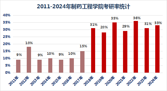 学院14届毕业生(2011-2024届)共 1732人中考取硕士研究生453 人(其中30名同学考取了博士研究生),32 人 考取南京大学、吉林大学等985、211高校的研究生;考研率连续13年名列全校第一,年平均考取率为26.2%。近七年,制药工程学院考研率平均在30%以上,在吉林省高校中名列前茅!
