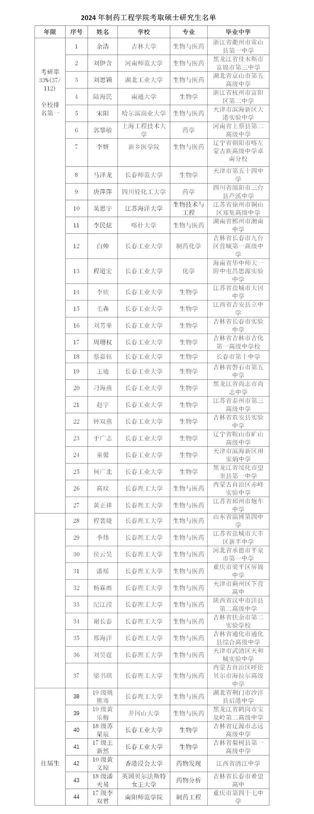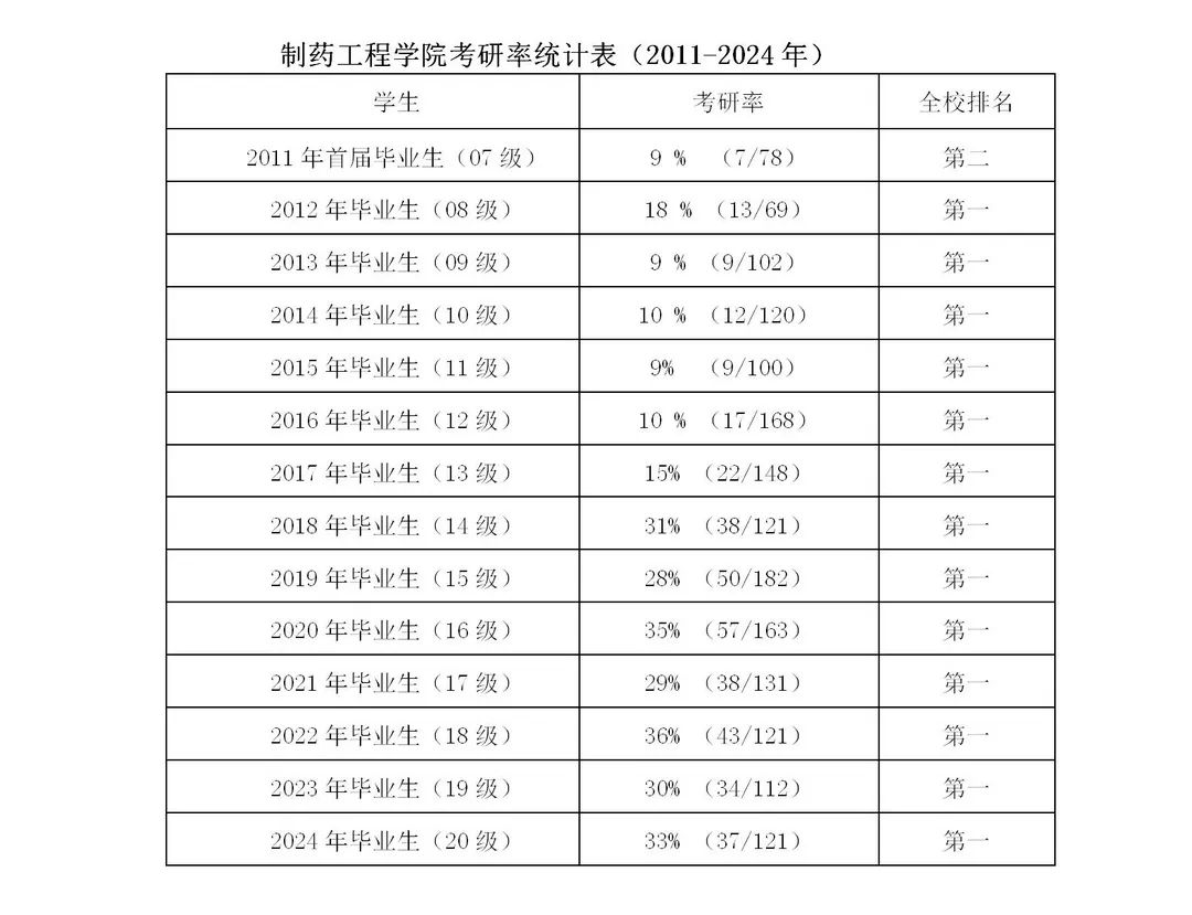 2024年制药工程学院学生考研率再创新高!考研报考率为67%(75/112),过线率为42.9%(48/112),录取率达33%(37/112)!连续13年名列全校第一!