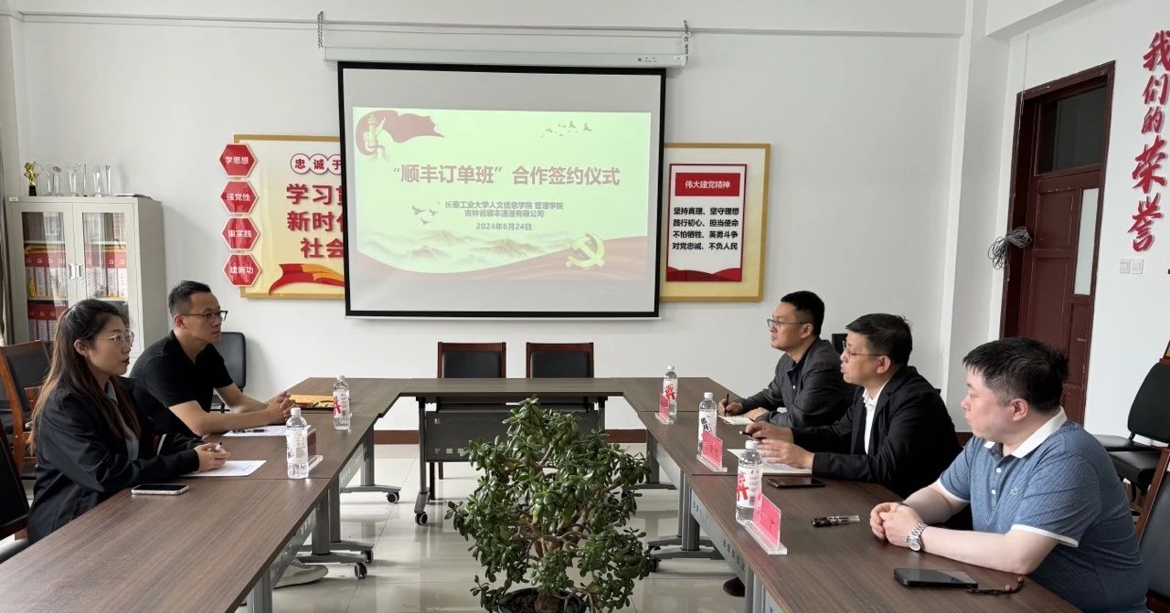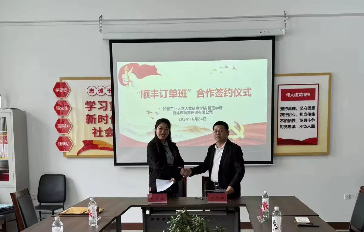 6月24日下午,我校管理学院与吉林省顺丰速递有限公司举行顺丰订单班设立签约仪式。学院院长宋殿辉,顺丰速递有限公司吉林区人才生态负责人林芳至代表校企双方签署订单班合作协议。学院党总支书记李振坤、实训中心主任孙广,顺丰速递有限公司招聘经理林立文共同参加了签约仪式。
