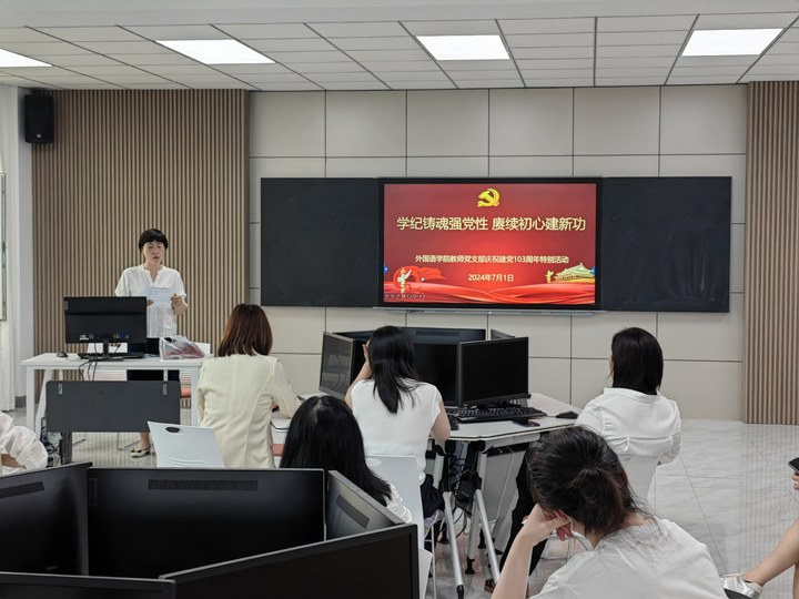 历史见证壮阔的征程,时间镌刻奋斗的足迹。从一叶红船到巍巍巨轮,中国共产党迎来成立103周年华诞。走过峥嵘岁月,历经风雨洗礼,百年大党风华正茂;永葆赤子之心,砥砺复兴之志,千秋伟业气势如虹。在 7 1 日这个重要的日子, 外国语学院教师党支部全体党员集聚一堂,开展题为学纪铸魂强党性 赓续初心建新功的特别活动,庆祝中国共产党成立103周年。