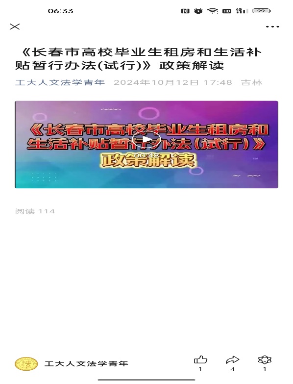1010日、1012日利用微信公众号对《长春市高校毕业生租房和生活补贴暂行办法(试行)》进行政策解读、《共享新吉遇 携手新未来》进行宣传,助力学生更全面地掌握相关信息,增强吉林就业政策宣传效果。