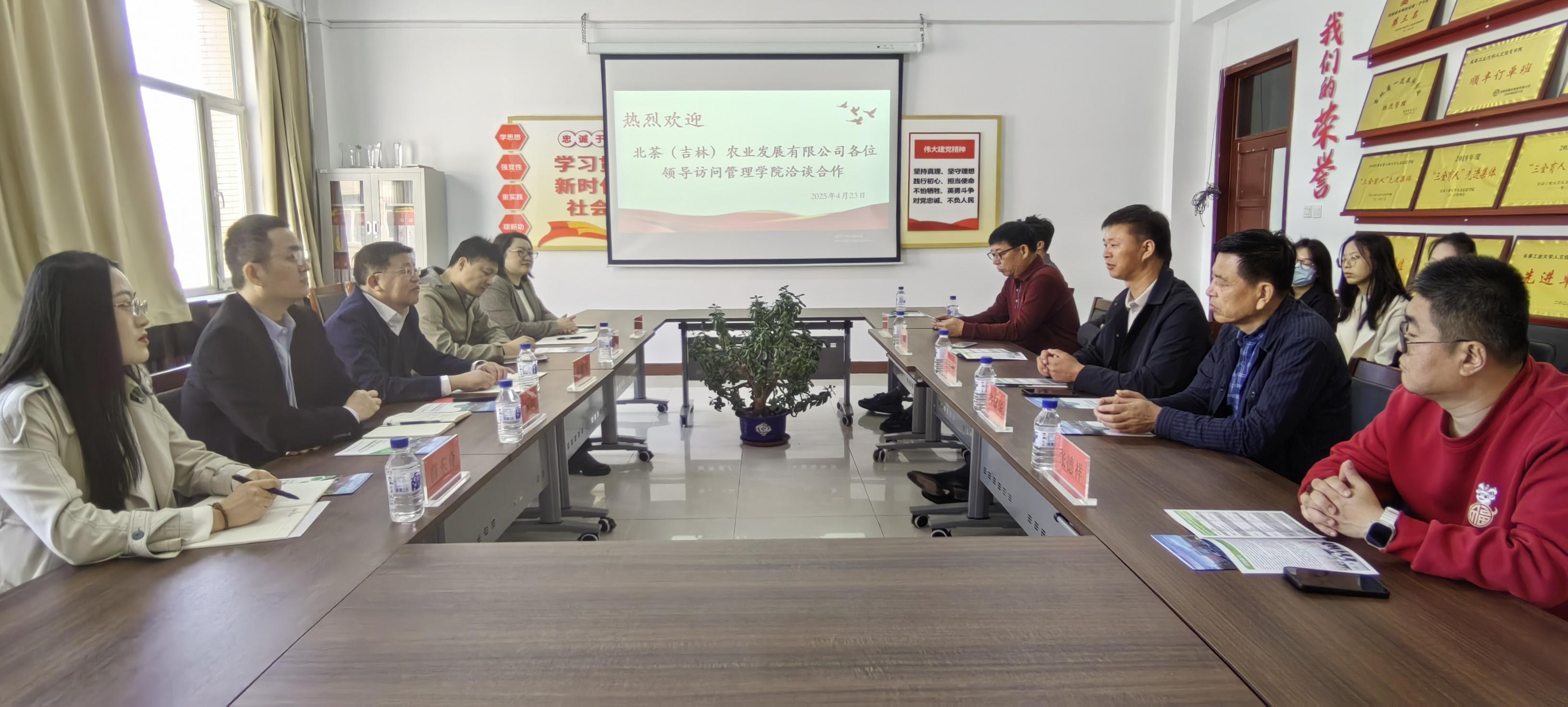 4月23日上午,应我校管理学院邀请,吉林省人大代表、北茶(吉林)农业发展有限公司董事长张德智,研学基地负责人张建华、招商部经理李鹏、运营部经理张德祥,长白山健康集团总裁杨一舟,吕致论一行来我校访问。