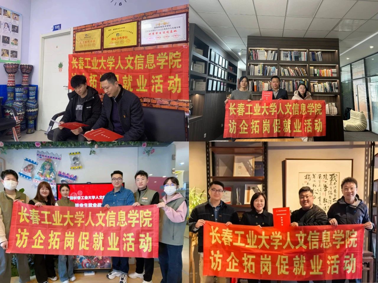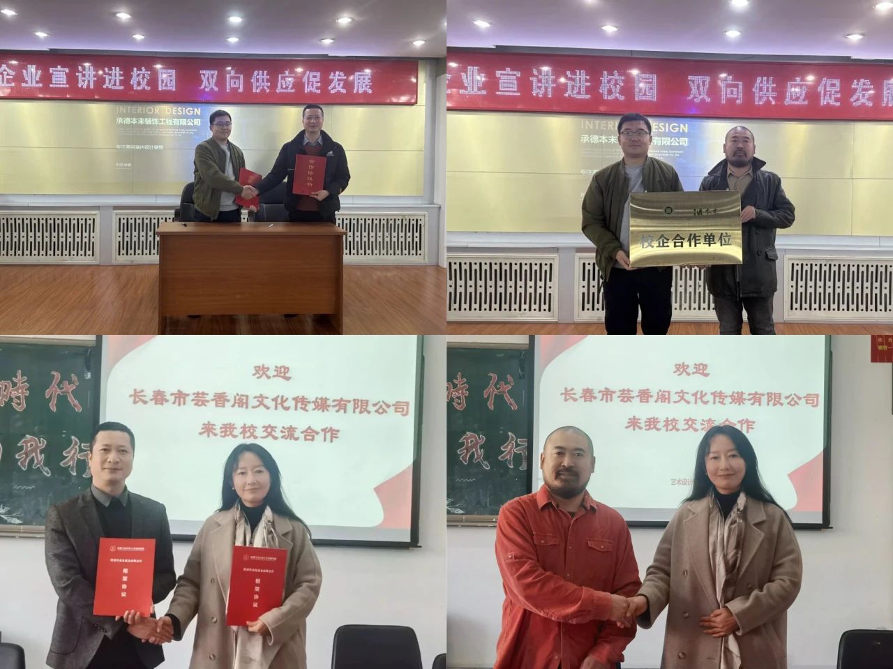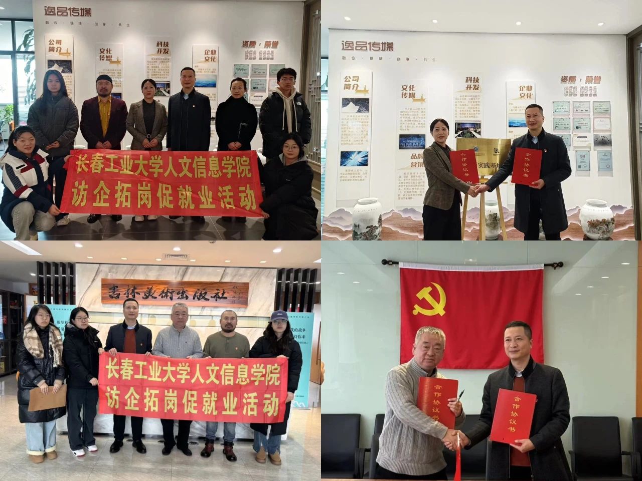 艺术设计学院先后走访吉林省逸品传媒集团有限公司、吉林美术出版社、承德本末装饰工程有限公司、芸香阁文化传媒有限公司、长春市朝阳区迦美艺术培训学校有限公司、长春瀚空间装饰设计有限公司、长春红海狸文化艺术发展有限公司、吉林省兴通园林工程有限公司、共创蔚来展览服务有限公司、吉林省澍雨教育科技有限公司、吉林省姗影文化传媒有限公司和吉林省洛卷图书发行有限公司共12家企业,签订校企合作协议书12份,共建教学实践基地。