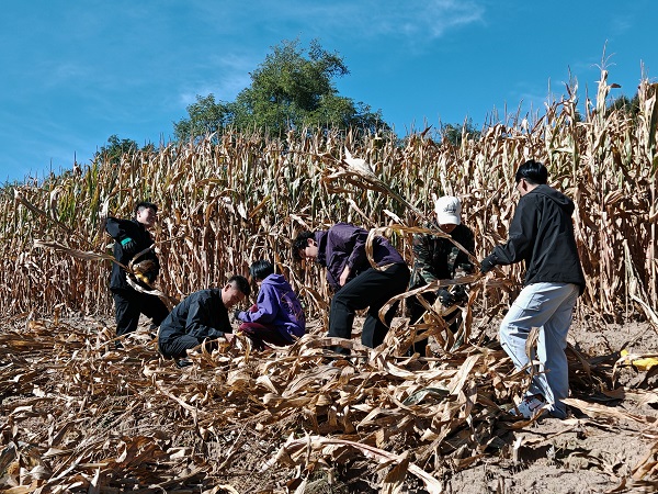 田间采收正忙,老师们穿梭其间,边劳作边指挥,同学们或坐或蹲,手脚不停。有人顺手帮身旁人递玉米穗,有人收空瓶时不忘搭把手归拢玉米堆。风裹着玉米叶的清香,大家眼里映着彼此劳作的模样,手忙着眼下零碎活儿,没有半分课堂上的拘谨。偶尔有人动作慢了,身旁人便笑着示意搭把手,大家边采收边唠家常,家常话混着“唰唰”采收玉米的声响,师生间的默契在这亲切互动里渐浓,距离也在悄悄拉近。劳动不再只是任务,更成为凝聚情感的纽带。