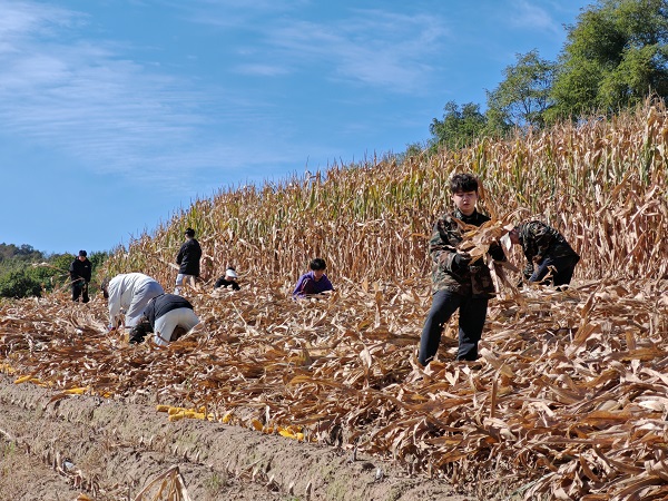 为深入贯彻落实教育部《关于全面加强新时代大中小学劳动教育的意见》精神,推动学校“育人为本、德育为先”办学思想与劳动教育要求深度融合,切实打通劳动教育融入人才培养全链条、各环节,10月8日,法学院13名志愿者在学院党总支书记刘宁、团委书记周远航、辅导员陈慧盈晰的带领下,前往伊通满族自治县二道镇石场村梨树沟屯贫困农户家中,通过徒手“扒苞米”的劳动实践,精准对接农户“秋收人手紧、抢收时间急”的急难愁盼问题,完成了与土地的一次“亲密对话”。