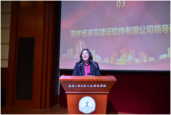 大会第三项,校企合作单位吉林省求实建设软件有限公司总经理宋艳萍讲话。在对获奖同学表示热烈祝贺与充分肯定的同时,畅谈了与我校合力推进校企深度合作的美好愿景。