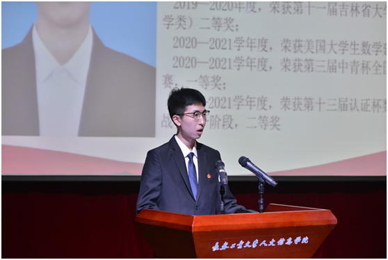 大会第五项,学生代表贾敏、张家瑞发言。贾敏同学获国家奖学金及多项专业竞赛奖项,张家瑞同学获美国大学生数学建模竞赛特等奖提名奖等多项奖项。两名同学现身说法,充分展现了“两强”学子的魅力。