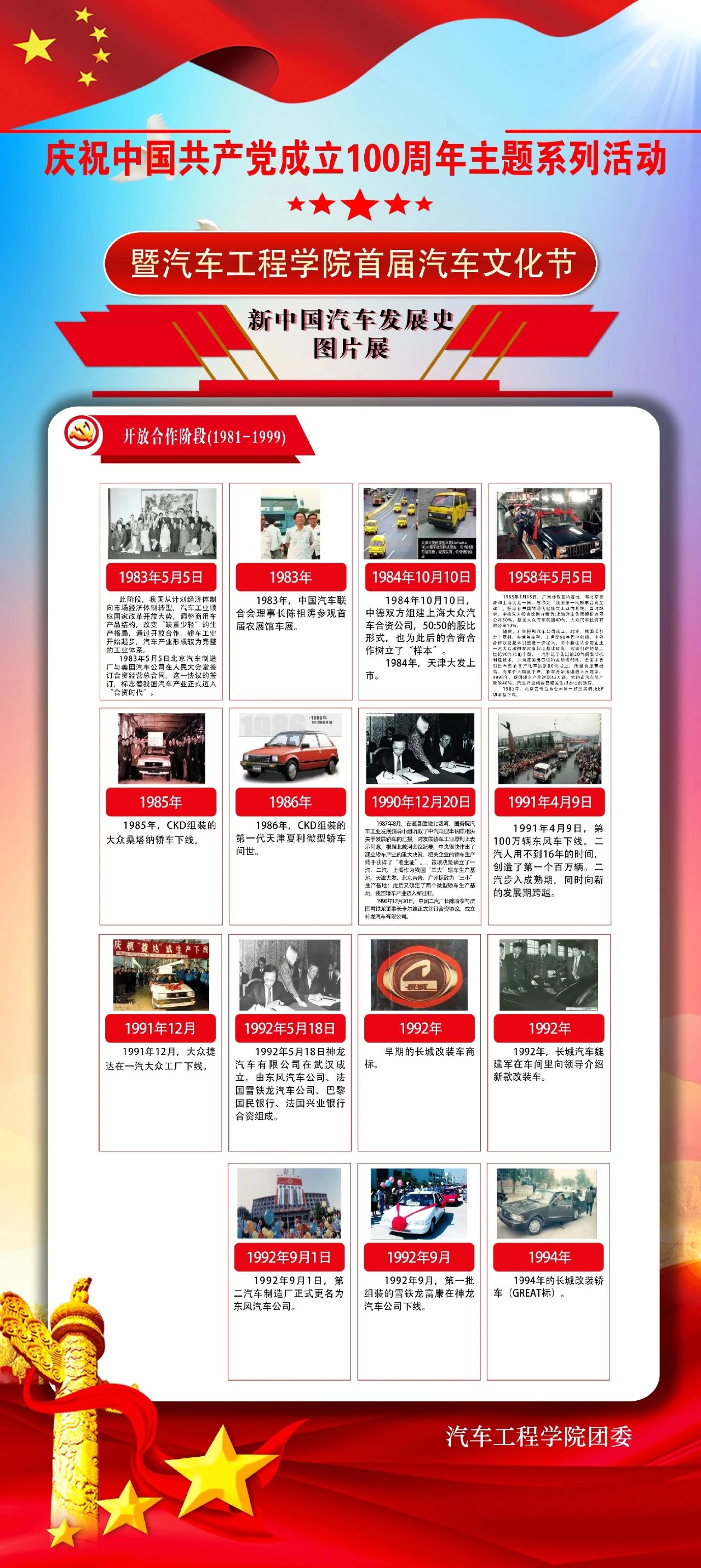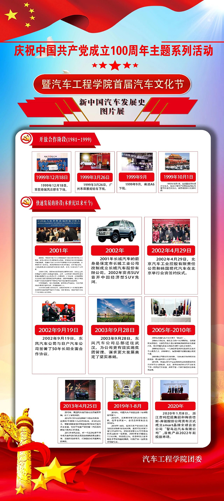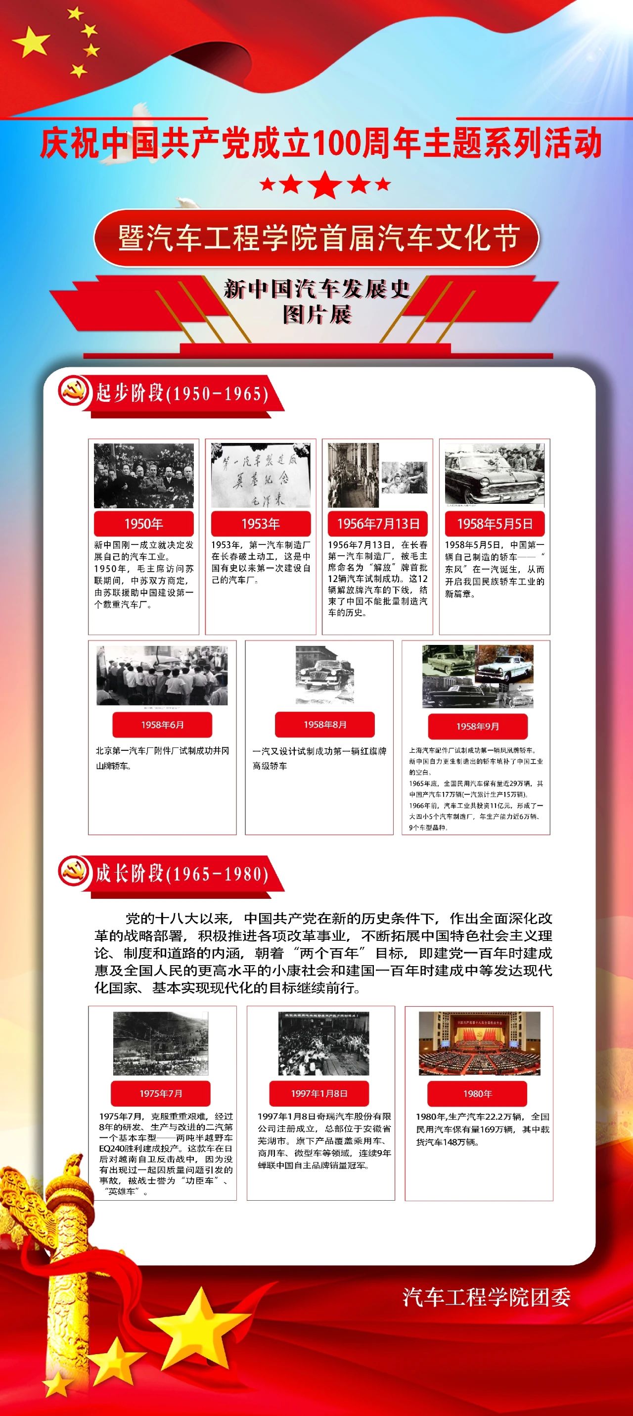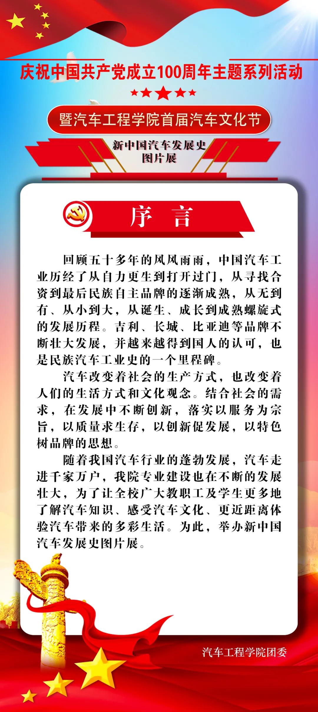 随着我国汽车行业的蓬勃发展,汽车走进千家万户,我校汽车专业建设也在不断的发展壮大,为了让全校广大教职工及学生更多地了解汽车知识、感受汽车文化、更近距离体验汽车带来的多彩生活。汽车工程学院举办了庆祝中国共产党成立100周年主题系列活动暨汽车工程学院首届汽车文化节——新中国汽车发展史图片展活动。