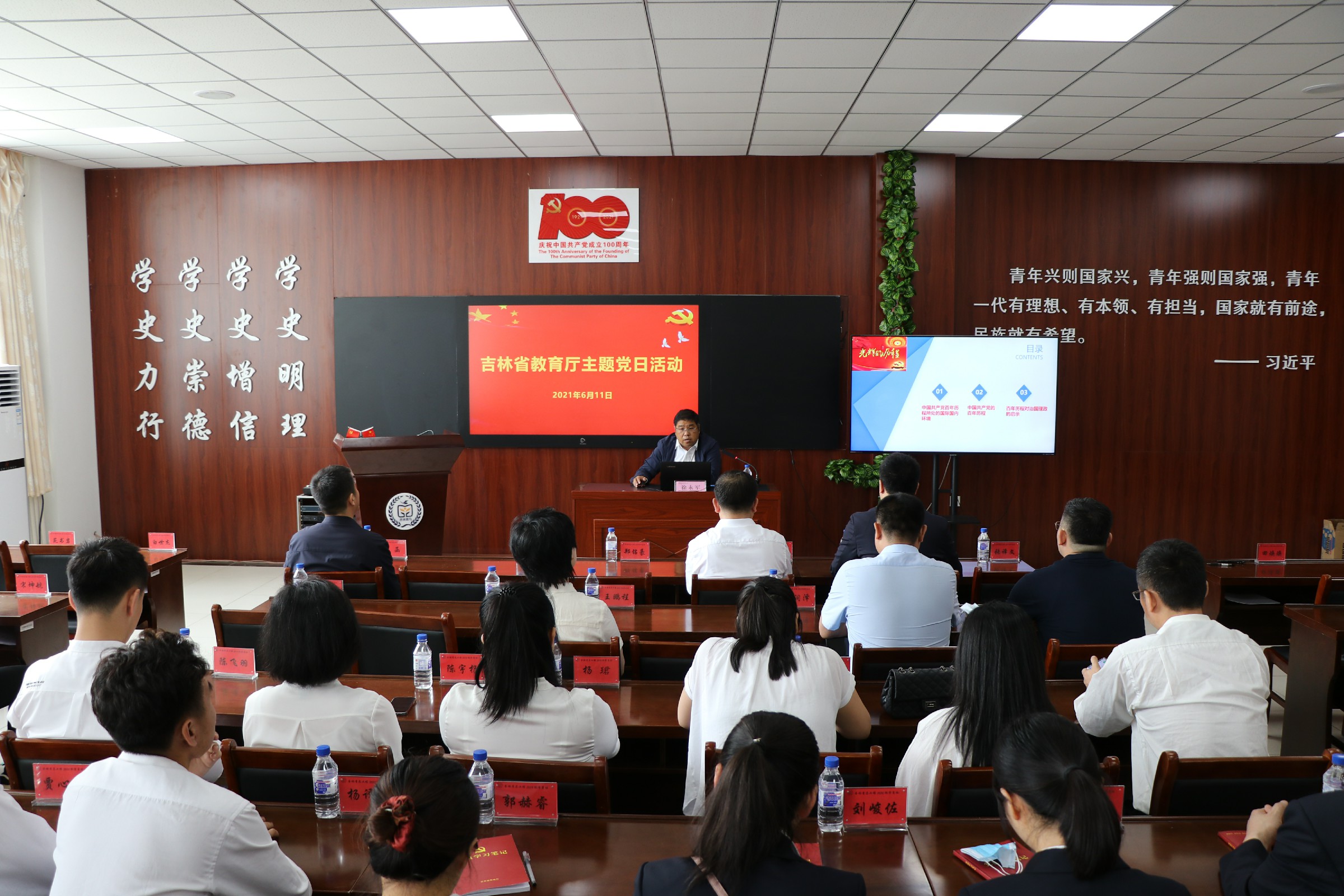 为庆祝中国共产党成立100周年,深入贯彻落实学校党委关于党史学习教育部署,教育引导广大党员师生学党史、悟思想、办实事、开新局,不断提高政治判断力、政治领悟力、政治执行力,聚焦落实立德树人根本任务。6月11日上午,我校管理学院教师党支部与结对共建的吉林省教育厅人事处党支部赴长春中医药大学“杏林青马工程”基地参观学习,联合开展“铭记初心、永葆本色”主题党日活动。本次主题党日活动还邀请到驻省教育厅纪检组党支部、长春外国语学校初三支部共同参加。