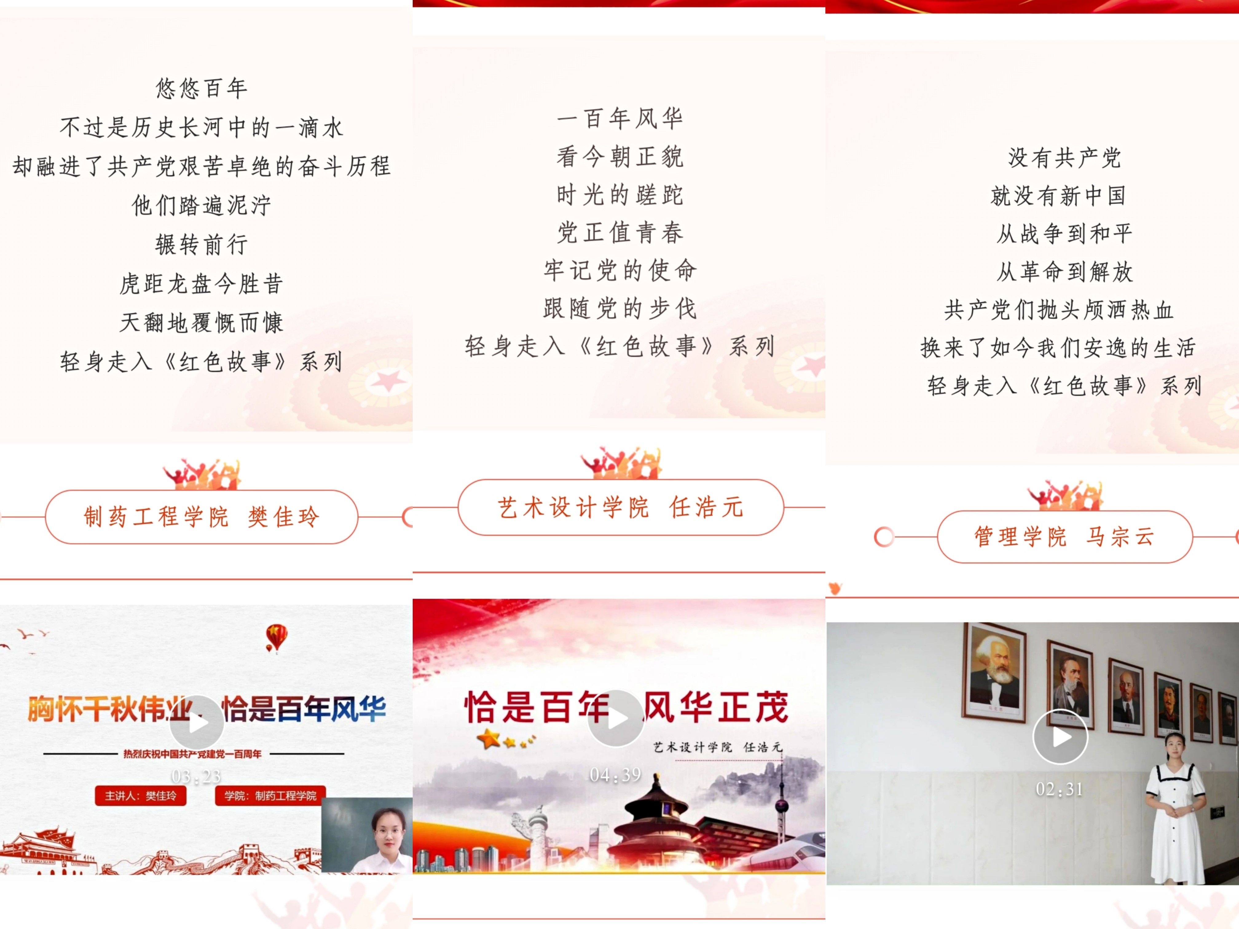 围绕喜迎建党100周年主题,“青春正风华·征途唯奋斗”团支部书记讲团课网络展示活动在全校师生中拉开帷幕,通过制作团课视频,生动展示中国共产党诞生、成长、壮大、取得辉煌成就的伟大光辉历程。同时,“奋斗百年路·启航新征程”庆祝中国共产党成立100周年主题系列活动的开展,其中制作讲述党史微视频,录制《在灿烂阳光下》《唱支山歌给党听》红歌快闪视频等,全校学生青年围绕“党史学习”用原创作品多角度、多类型、深层次地表达人信青年对党史学习的深刻理解,为建党百年献礼。