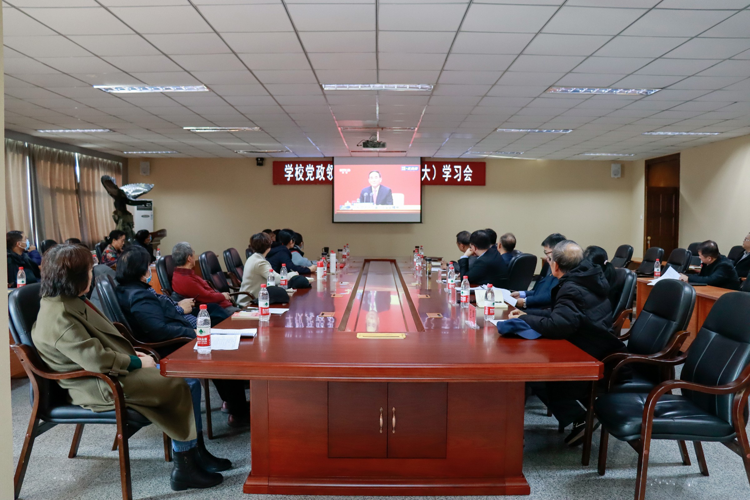 11月12日上午,学校召开党政领导理论中心组(扩大)学习会,集中收看党的十九届六中全会精神新闻发布会。董事长张兆华,校长潘福林,党委书记王煊等学校领导班子成员,党委委员,各学院院长,各党总支(直属支部)书记参加会议。