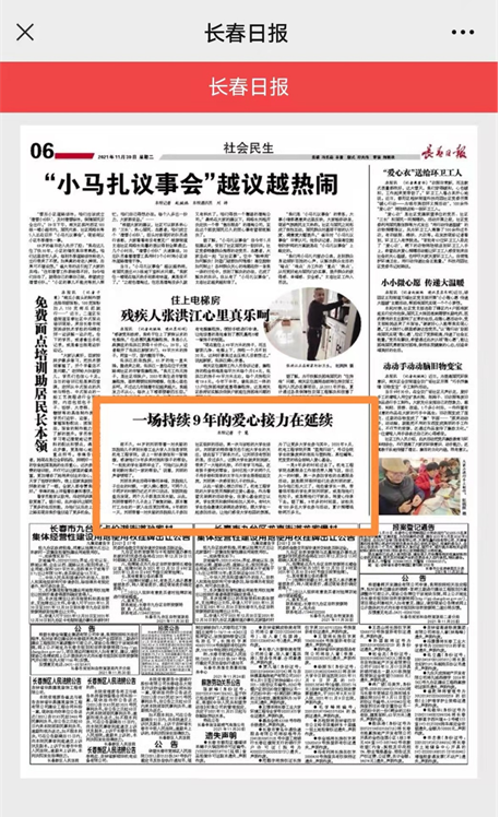 2021年11月29日,机电工程学院帮助聋哑儿童的事迹被长春日报报道。自2013年以来,机电工程学院以党员先锋服务队为先锋力量的志愿服务队伍始终坚持对聋哑儿童吴优、吴悦(化名)进行帮扶资助。