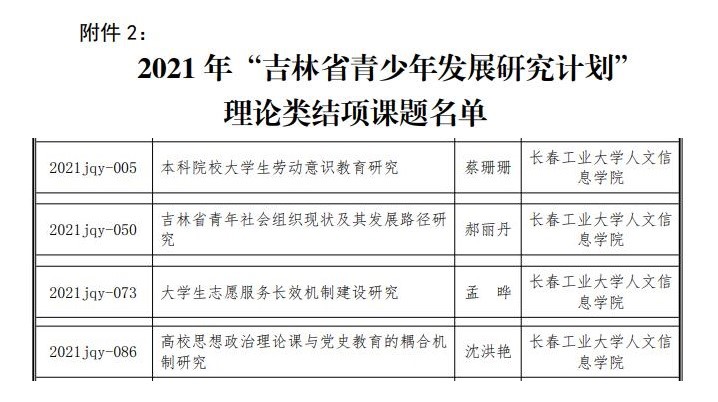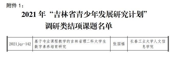 近日,共青团吉林省委公布了2021年度“吉林省青少年发展研究计划” 课题结项通知,我校共有5项课题顺利结项。