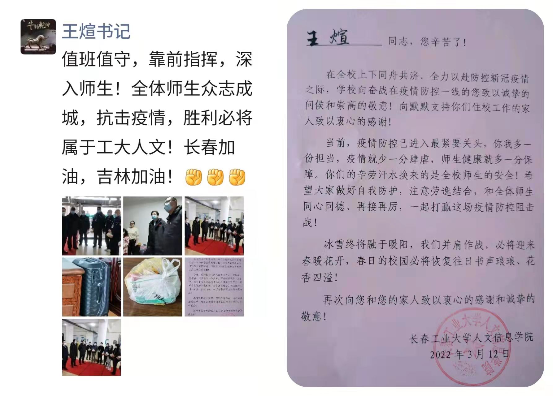 3月12日、13日,校长潘福林,党委书记王煊,副校长李晓科,校长助理兼党委组织部部长贺同华等校领导带队,代表董事长,代表学校看望慰问疫情防控一线教职工。