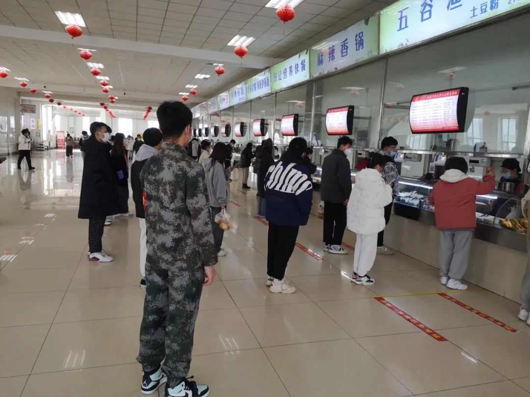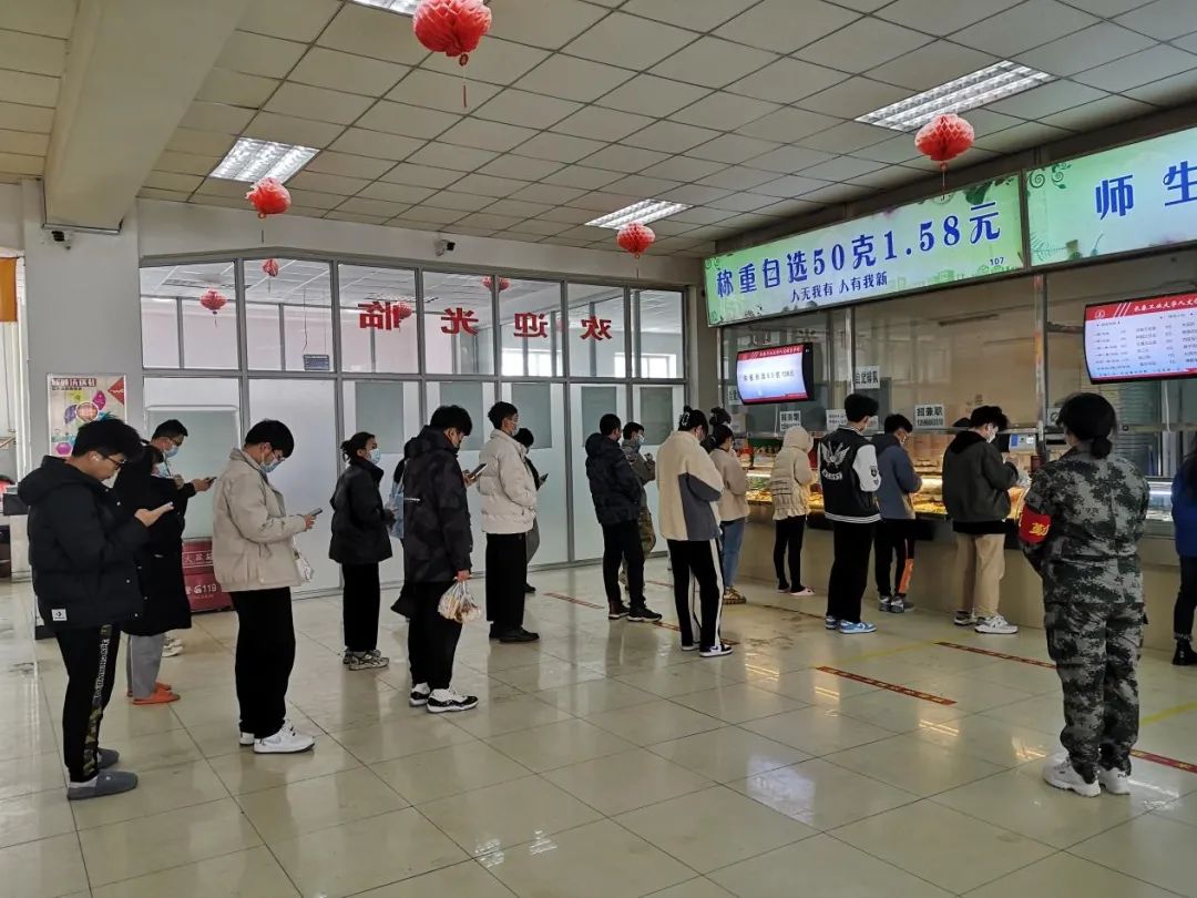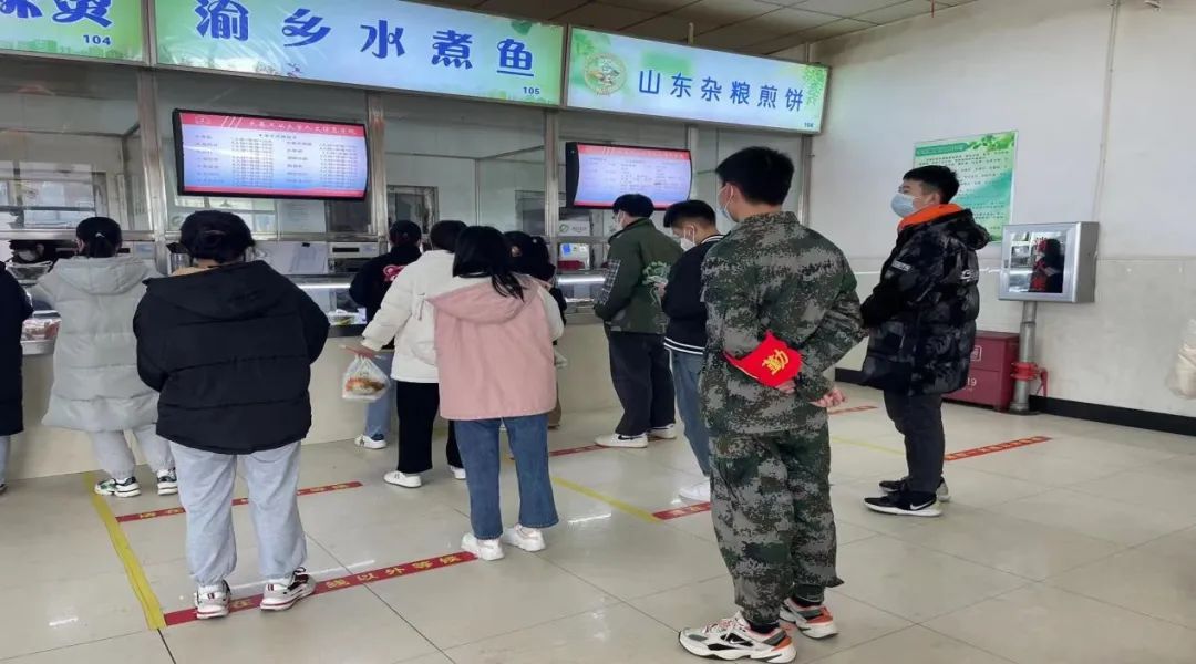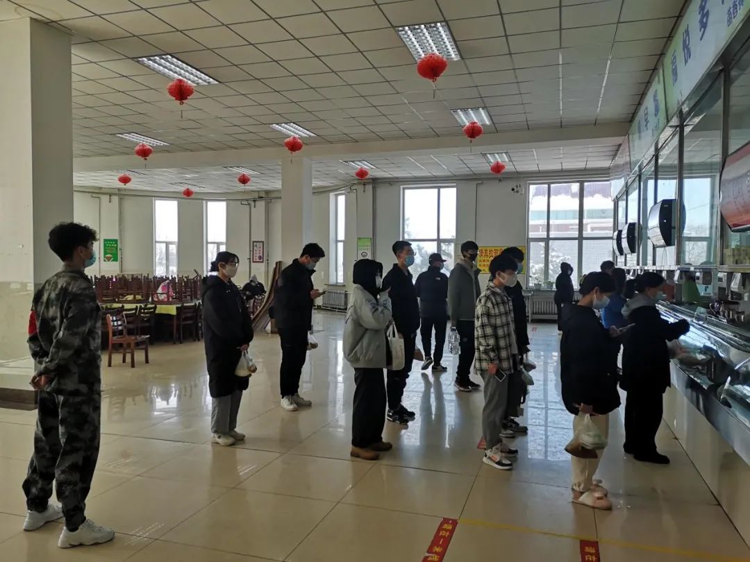 在疫情防控的关键阶段,学校大学生预备连退役学生主动请战,担任学校志愿者,在学校食堂确保购餐间隔、维持排队秩序。