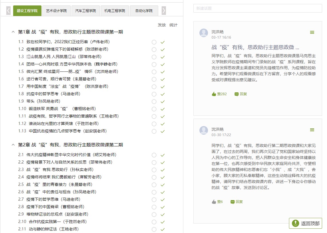 马克思主义学院充分利用学习通平台开设战“疫”有我 思政助行思政微课堂,第一期共完成了13个小专题的微课,内容围绕当前同学们最关注的战“疫”主题,结合五门思想政治理论课从国情、党的领导、制度优势、中国精神、马克思主义哲学等多角度讲解科学防疫政策,分享抗疫中感人的故事,阐述中国制度优势。由马院全体思政导师向对接分院学生推送,范围覆盖全校学生。