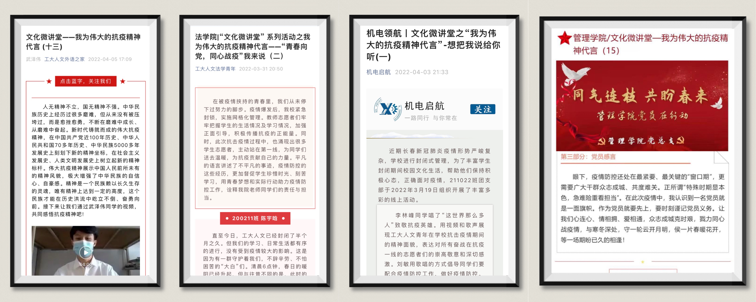 三月以来,长春工业大学人文信息学院紧紧围绕省市教育系统疫情防控工作部署和要求,全媒体开展新闻宣传和舆论引导,在做好校园网和新媒体新闻宣传的前提下,依托学校“文化讲堂”这一品牌,线上开展“文化微讲堂—我为伟大的抗疫精神代言”活动,讲好学校抗疫故事,学习、践行伟大的抗疫精神,引导广大师生正确认识疫情,强信心、暖人心、筑同心,不断凝聚起全校师生众志成城、共克时艰的强大正能量,为打赢疫情防控阻击战营造了浓厚舆论氛围。