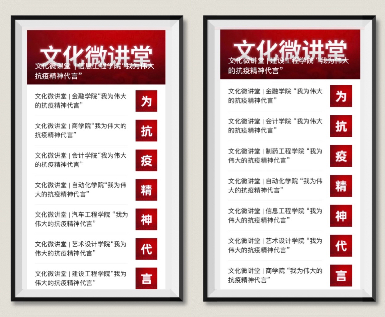 截至目前,围绕“文化微讲堂——我为伟大的抗疫精神代言”活动,校院两级官方微信平台共发布推送246篇,制作微视频132部,全网阅读、播放点击量128521次。“我为伟大的抗疫精神代言”,展现出全校师生团结一心、同舟共济的精神风貌,凝聚起众志成城抗疫情的强大力量。在全市启动清零攻坚行动的全盘部署下,全校师生一定会直面困难、迎难而上,强信心、暖人心、筑同心,以高昂的精神风貌,必胜的工作信念,务实的工作举措,全面夺取疫情防控阻击战的伟大胜利。