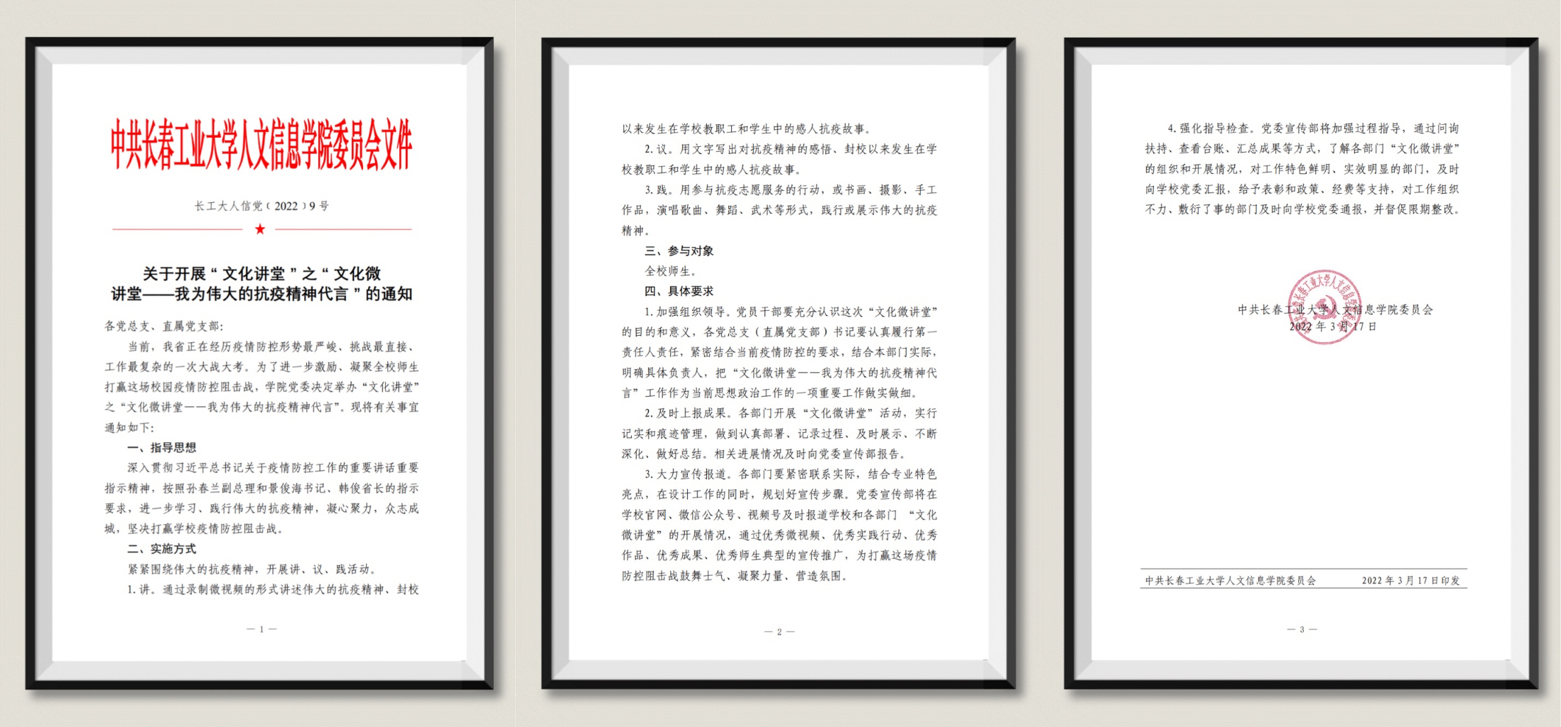 校园疫情防控伊始,校党委宣传部即下发了《关于开展“文化讲堂”之“文化微讲堂——我为伟大的抗疫精神代言”的通知》,动员全校师生积极彰显主人翁意识,主动担当,学习和践行伟大的抗疫精神,打赢校园疫情防控阻击战。校党委召开专项工作部署会议,要求各党总支、直属党支部统一思想,提高认识,各党总支(直属党支部)书记要认真履行第一责任人责任,紧密结合当前疫情防控的要求,结合本部门实际,明确具体负责人,把“文化微讲堂——我为伟大的抗疫精神代言”工作作为当前思想政治工作的一项重要工作做实做细。