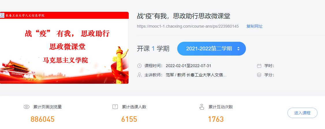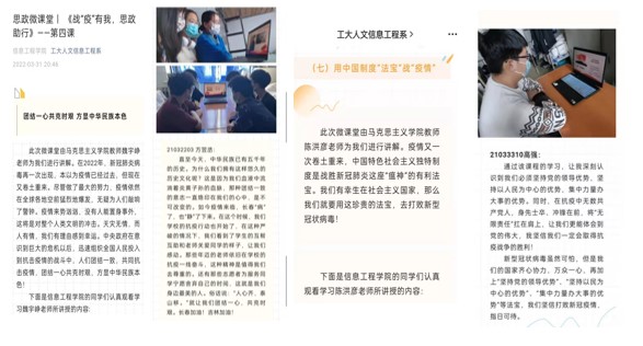 为切实落实省委教育工委的相关工作要求,加强疫情期间对大学生的思想引领和政治教育,充分发挥思政课教学主渠道作用,长春工业大学人文信息学院马克思主义学院充分利用学习通平台开设战“疫”有我 思政助行思政微课堂,由马院全体思政导师向对接分院学生推送,范围覆盖全校学生。