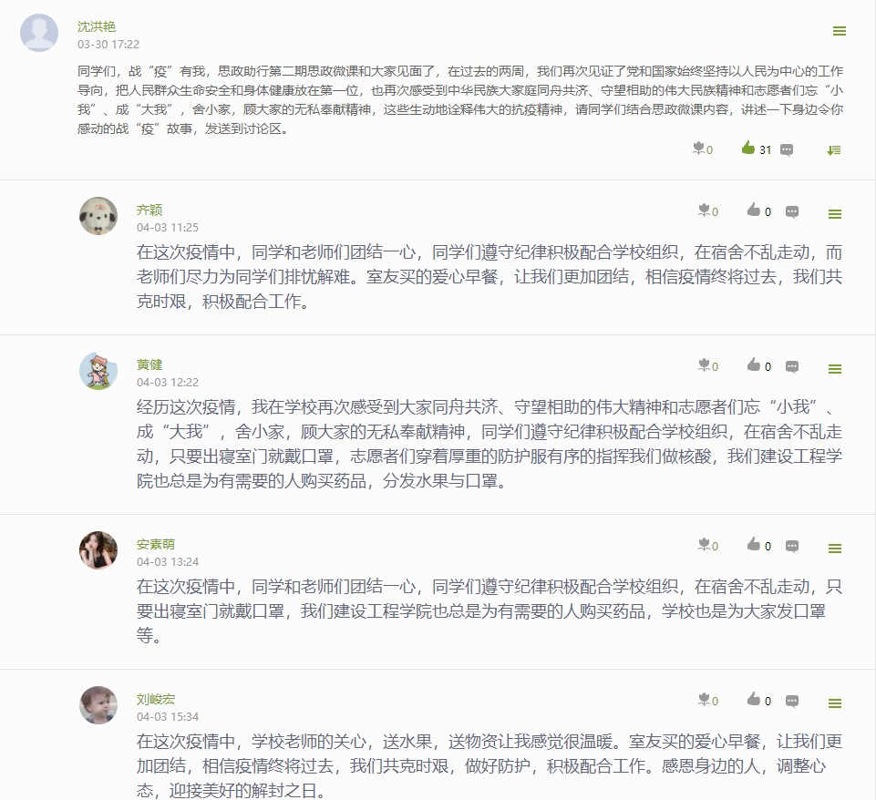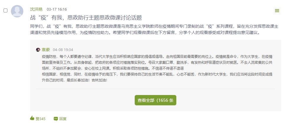 各分院学生积极参与收看,并展开了热烈讨论,纷纷留言分享收看后的心得。截至目前,学生累计选课6155人,页面浏览量总计达886045次,学生累计参与线上讨论1763人次。