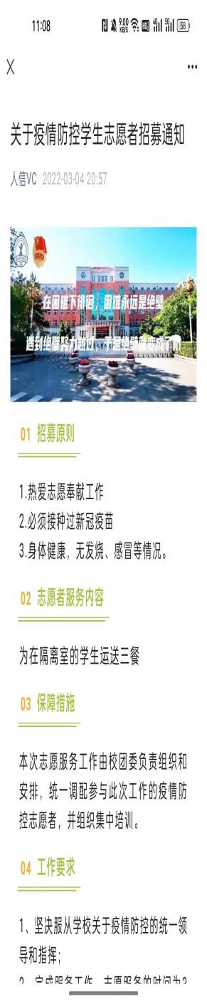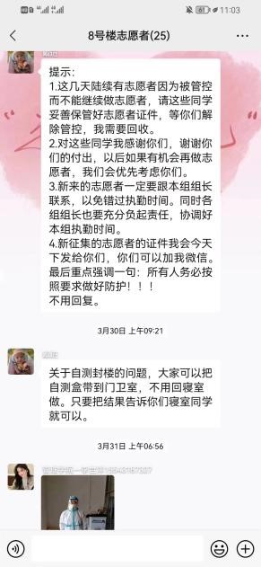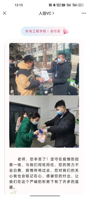 志愿服务热情高涨。抗击疫情,刻不容缓;同舟共济,共克时艰。校团委关于疫情防控学生志愿者招募的通知一经发出,全校广大团员青年积极响应,立即行动,322名志愿者踊跃报名,因岗位需求,校青马班学员、自动化学院的闫钰等141余名学生志愿者投身到抗疫一线,累计奉献时长14352小时,青年学生用实际行动助力打赢疫情防控阻击战。他们在保证自身防疫安全的基础上分为隔离寝室送餐志愿者、协助核酸检测志愿者、摆渡车秩序维护和协助门岗秩序维护、身份查验志愿者等,各学院的学生志愿者协助辅导员老师做好情况摸排、区域值守、安全管控、物资保障等疫情防控工作。志愿者每天工作时长平均在6小时以上。法学院210212班巩庆被校团委任命为志愿者一组组长,负责隔离寝室楼送餐工作,为了给同组的小伙伴做出表率,每天都是提前十五分钟到岗换上防护服。他说,穿上防护服的那一刻感觉自己帅炸了,不过整整6个小时不能脱下防护服,过程中感觉很闷、流了很多汗,平日里很难体会这样的辛苦。但是他认为自己和伙伴们所做的都很值得,正因为每一个人都很有责任心,负责、严谨又细心,尽己所能为学校疫情防控出一份力,才能够让更多学生感受到整个学校大家庭的温暖!更加凝聚抗击疫情的强大信心!