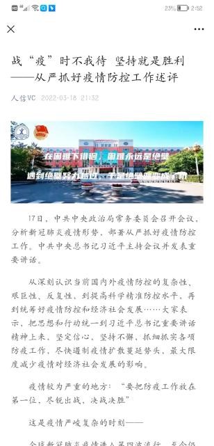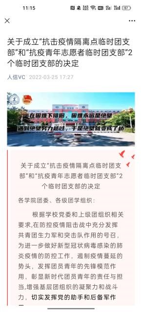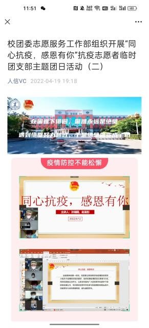 网上思想引导阵地筑牢。校团委充分发挥团学组织新媒体平台建设优势,将防疫知识学习,学校疫情防控工作精神,抗疫学生典型等作为重点宣传任务,将团员青年的思想引领做在网上,力争做到学生心里,凝聚共识、坚定信心。从3月10日至5月25日,校团委利用“人信VC”微信公众号累计发布宣传推文240篇,总阅读量达72565人次。发布“‘同心抗疫 共克时艰’学生志愿者战疫日记”推文6期,挖掘和报道先进典型事迹35篇,充分发挥先进典型的示范引领作用,形成众志成城、共克时艰的强大合力。