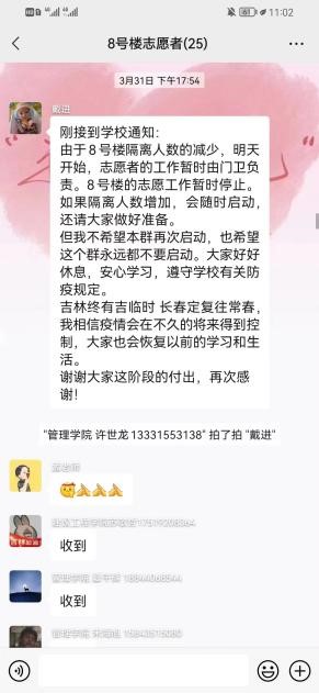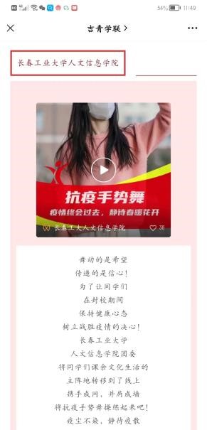 在此期间,我校成立“抗击疫情隔离点临时团支部”和“抗疫青年志愿者临时团支部”,并在疫情防控工作发挥着积极作用的做法被省教育工委简报刊载,志愿者的战疫日记被省高校网络思政工作中心宣传报道,我校青马突击队战疫纪实,青春同心--疫情下的寝室生活被团省委宣传报道,我校信息工程学院学生刘文斌创作的居家生活漫画在团省委吉青学联公众号公开发布。累计得到上级组织和部门的宣传报道十余次。