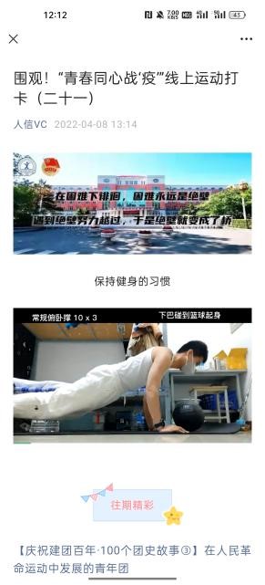 团学活动内容丰富。为更好地丰富疫情下的校园生活,减少因疫情带来的心理焦虑,校团委号召团学组织和社团依托各自组织特色,推出“暖心活动”,为青年搭建释放压力、充实生活的平台。推出云才艺展示、云健身、云分享等各类活动,面向13个学院征集并发布云才艺展示,线上运动打卡,校园线上配音秀等形式多样的青春作品168件,发布公众号推文72期。同时,制作了“带你解锁不一样的封校生活”“爸爸妈妈请放心,我在学校挺好的”等暖心推文,总阅读量达17029人次;制作了“疫情之下我不怕,因为辅导员和我们在一起”公众号推文9期,学生们借此表达了疫情之下特殊时期对在校教师舍小家为大家的深深敬意和感恩之情;同时开通广播站线上点歌,在“人信青年”抖音账号发布《致敬抗疫一线勇者》《送你一朵小红花》《病毒走开》等原创视频作品十余件。营造了校内外、立体式的疫情防控宣传氛围,为坚决打赢疫情防控战疫,筑牢科学依法防疫意识,凝聚抗击疫情的青春力量,彰显了青春担当。