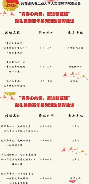 我校师生收看庆祝中国共青团成立100周年大会盛况被省教育厅宣传处、共青团吉林省委宣传报道,我校学生制作的庆祝建团百年的海报,原创青春视频《致时代 致青春》也被团省委专题报道。