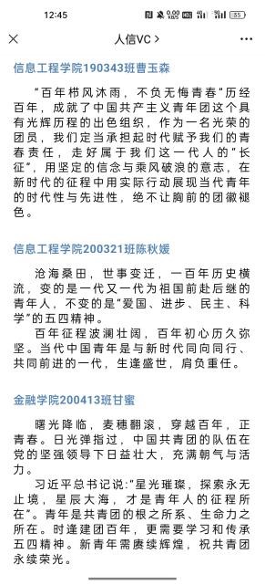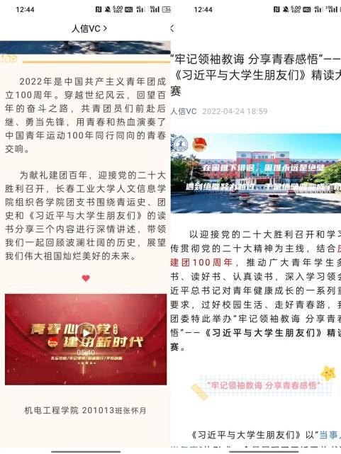 “疫”线献礼燃青春。校团委通过线上展播100个团史故事、中国青年运动史大事记等,团结引领广大团员青年传承伟大的“五四精神”,进一步发挥团员青年在疫情防控工作中生力军、突击队的作用。各学院的青年学生在建团百年“青春心向党 奋进新征程”献礼建团百年系列活动中广泛参与、积极响应,在《习近平与大学生朋友们》精读大赛、团支部微团课大赛,青春献礼二十大视频,建团百年主题海报展”,“忆百年芳华、抒写青年誓言”等十余项教育活动都体现了我们身边的青年力量的思想成长。青马学员、学生会骨干热议习近平总书记在中国人民大学考察时发表的重要讲话精神。全校广大团干部团员青年学习并热议习近平总书记在庆祝中国共产主义青年团成立100周年大会上的讲话精神。大家纷纷表示,要在实现中华民族伟大复兴中国梦的新征程上奋勇前进,用青春的能动力和创造力激荡起民族复兴的澎湃春潮,用青春的智慧和汗水打拼出一个更加美好的中国!