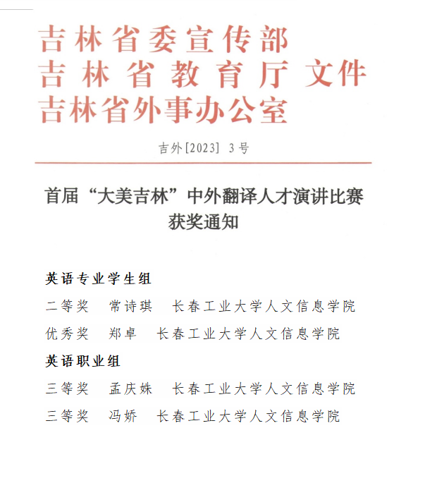 由吉林省委宣传部、吉林省教育厅、吉林省外事办联合举办的首届“大美吉林”中外翻译人才演讲比赛于2022年12月14日结束,来自我省机关、学校、企事业单位1012名选手参加了比赛,154名选手进入了决赛。我校外国语学院学生常诗琪、郑卓分别获得英语学生组二等奖和优秀奖;英语教师孟庆姝、冯娇分别获得英语职业组三等奖。