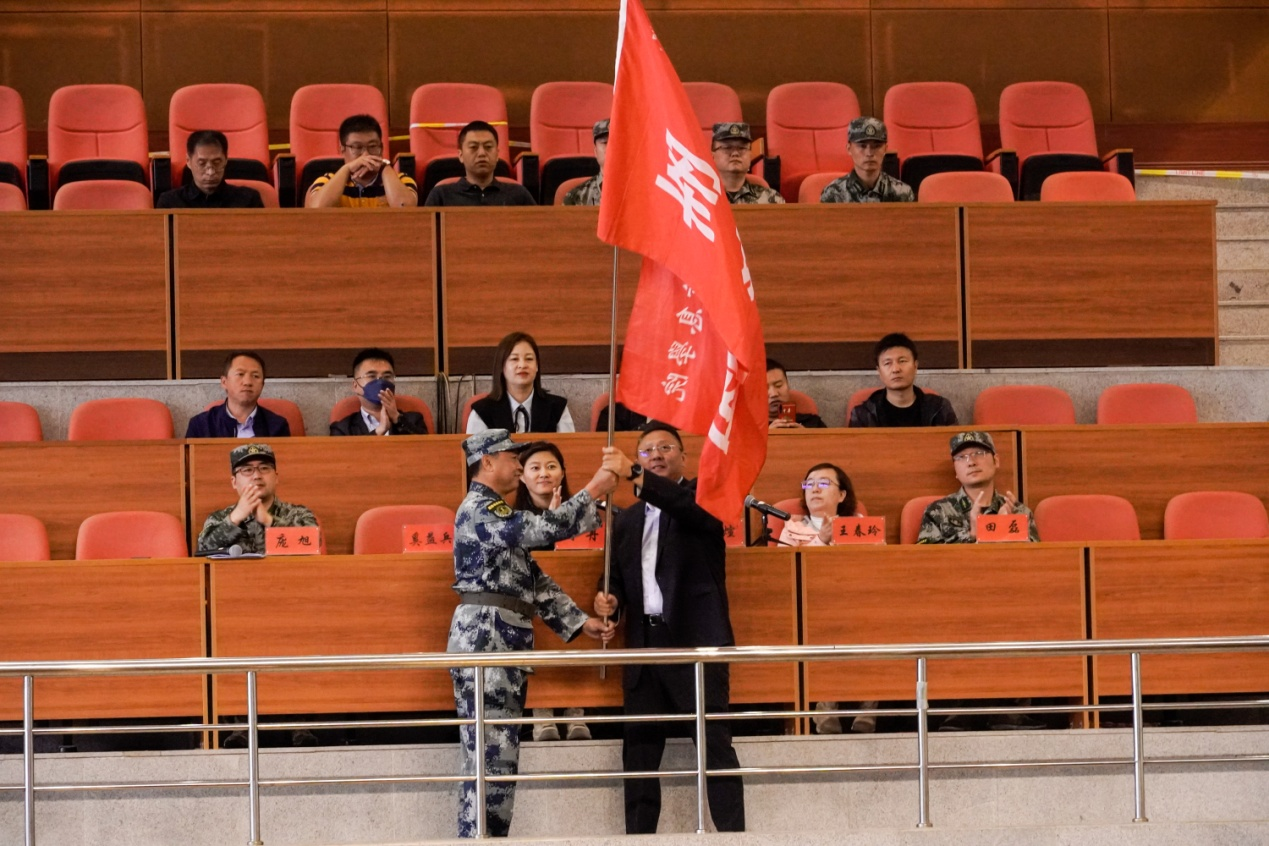 王煊向军训团团长奚益兵授军训团团旗。
