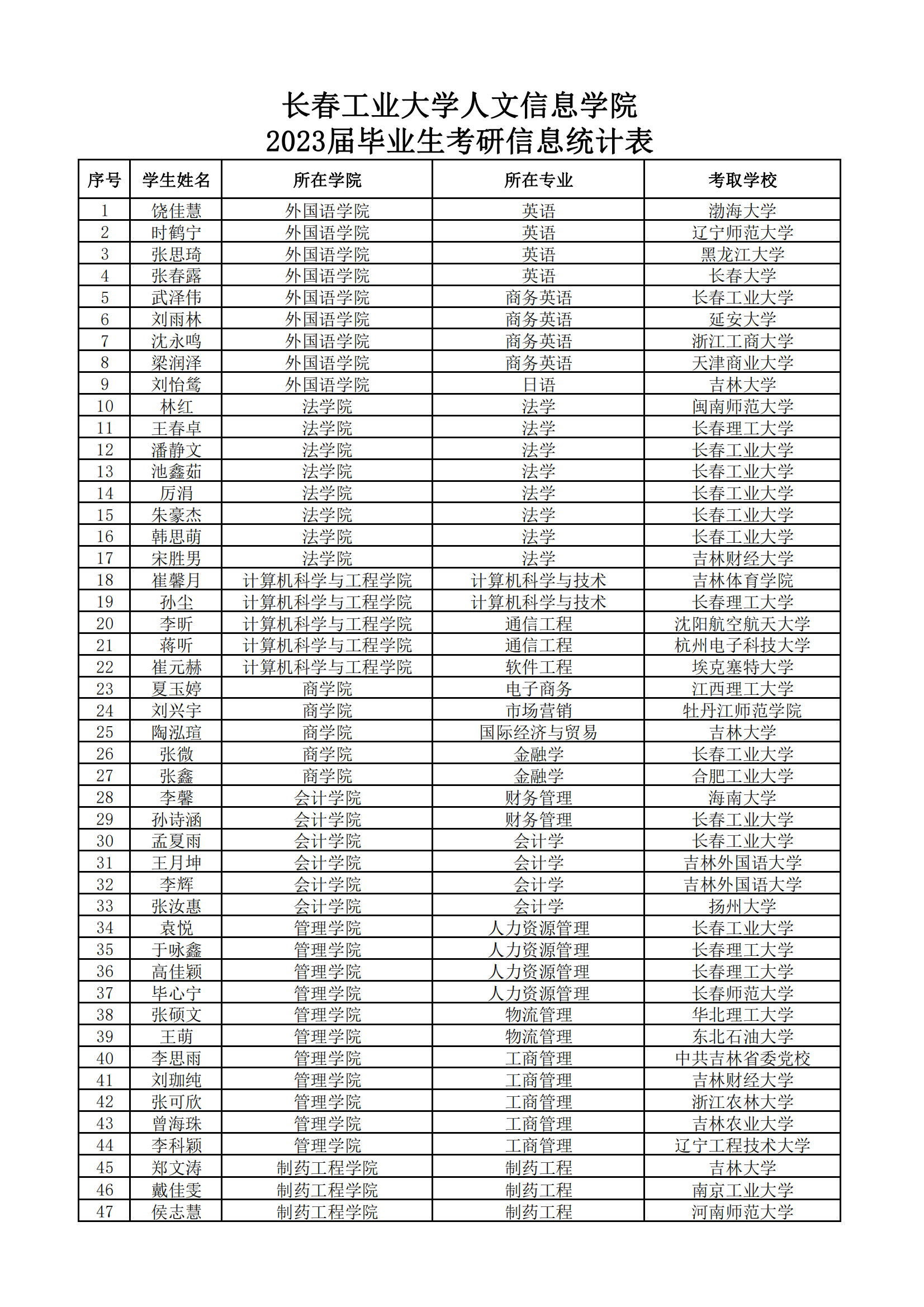 伴随着2023届毕业生考研复试落下帷幕,我校考研再创佳绩,成绩喜人。全校共有96名学生考取吉林大学、武汉大学、广州大学、埃克塞特大学等国内外知名高校硕士研究生,考取人数与考取学校层次均稳步提升。