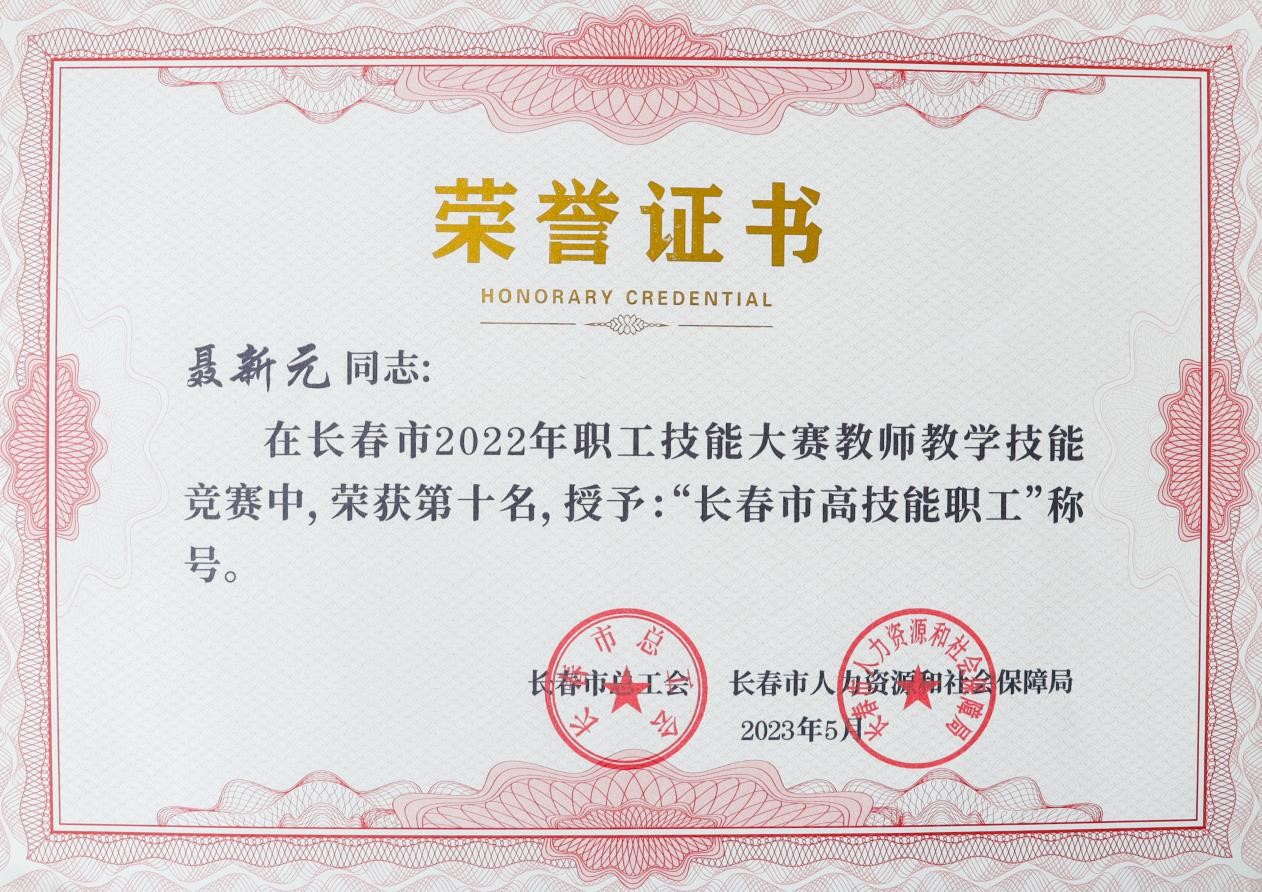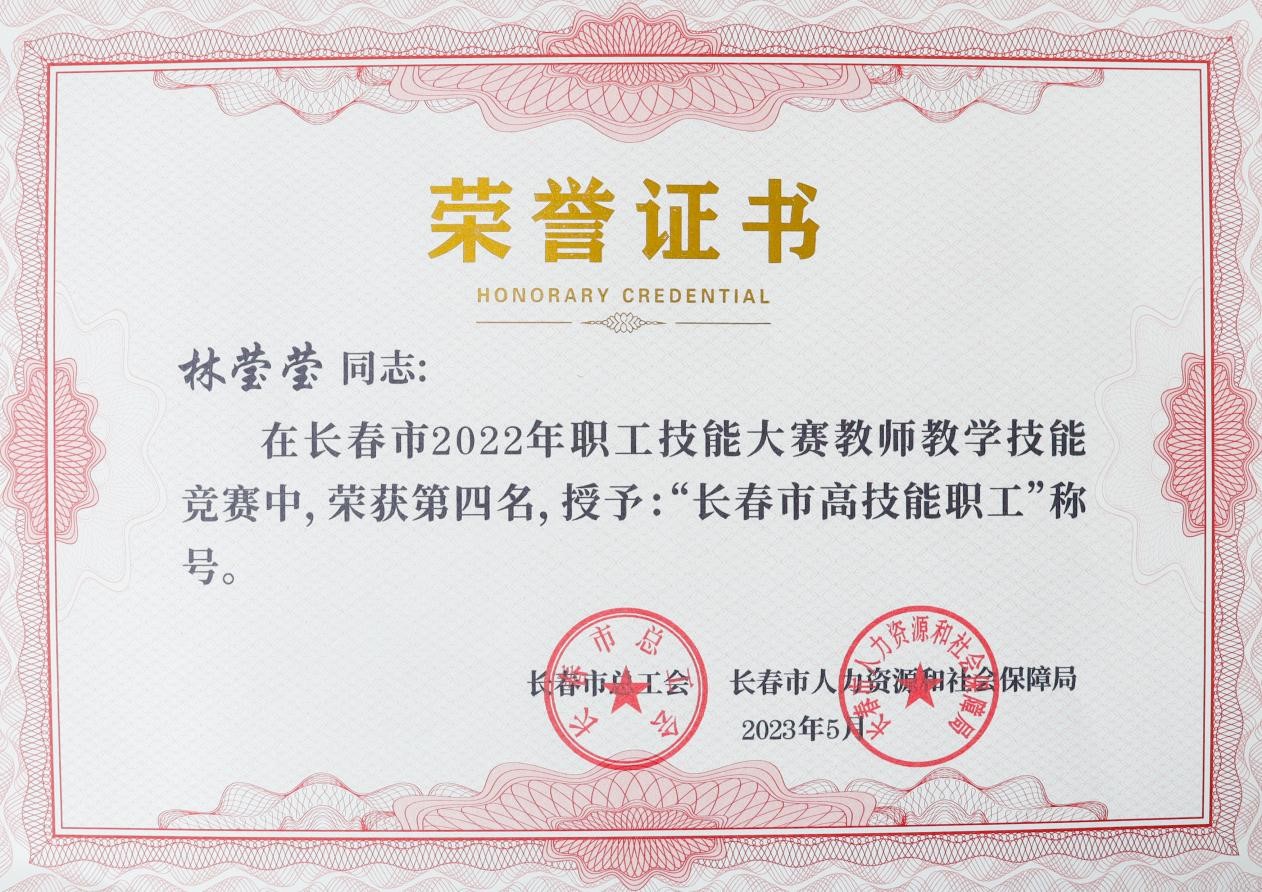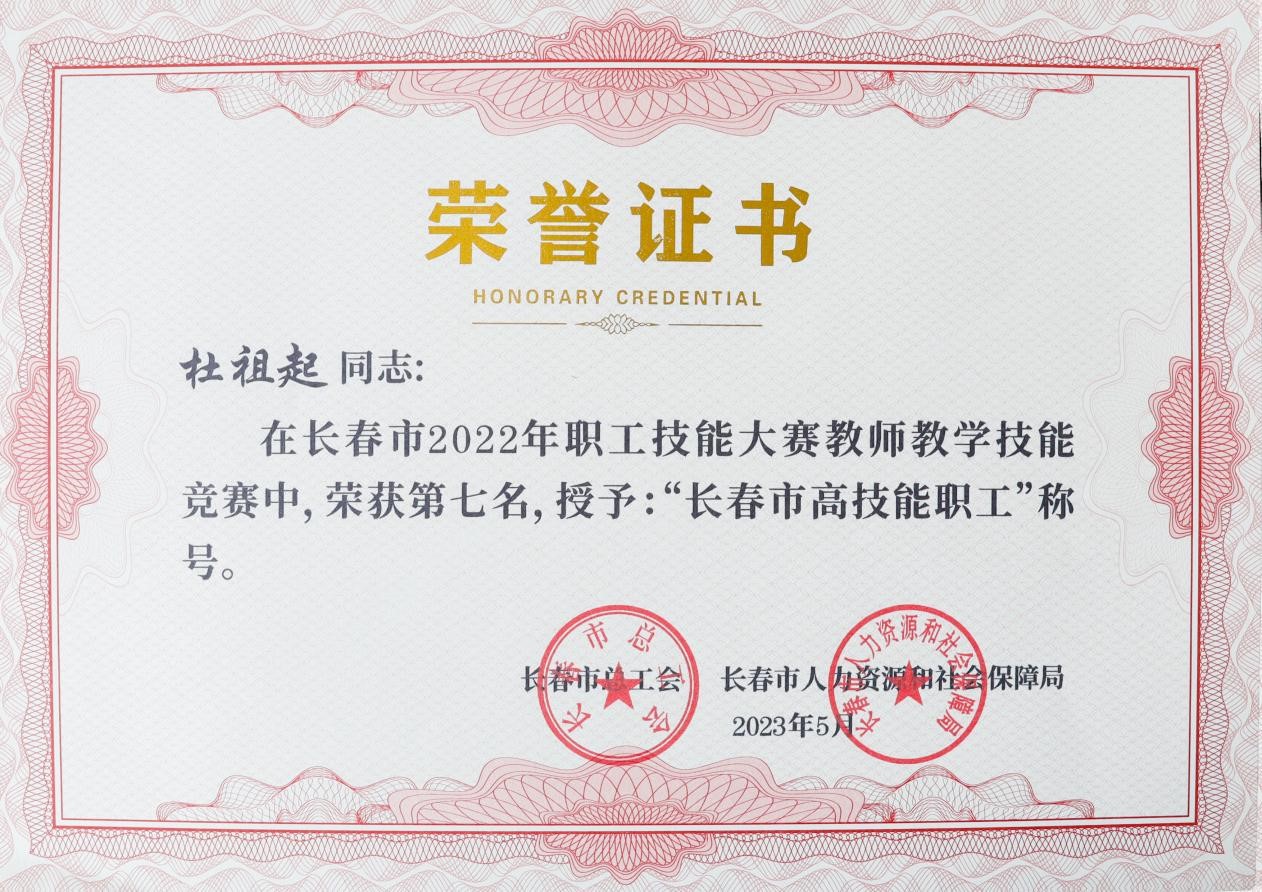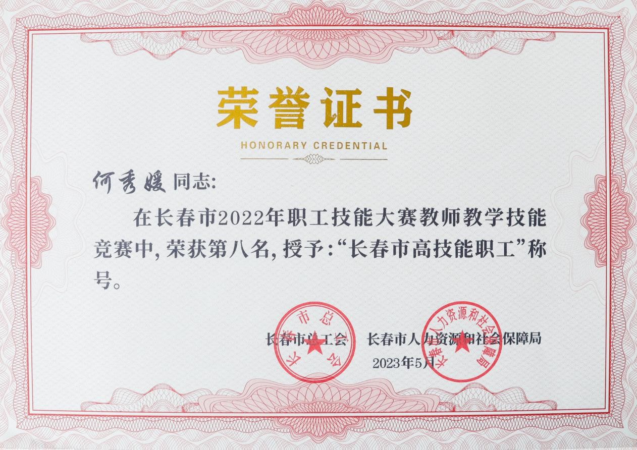 近日,长春市总工会、长春市人力资源和社会保障局联合下发长会联字[2023]5号文件《关于长春市2022年职工技能大赛工作情况的通报》,我校李洪亮、伏玉、李慧敏、林莹莹、于晓慧、于春艳、杜祖起、何秀媛、高娅、聂新元、张玉霖荣获“长春市高技能职工”称号。
