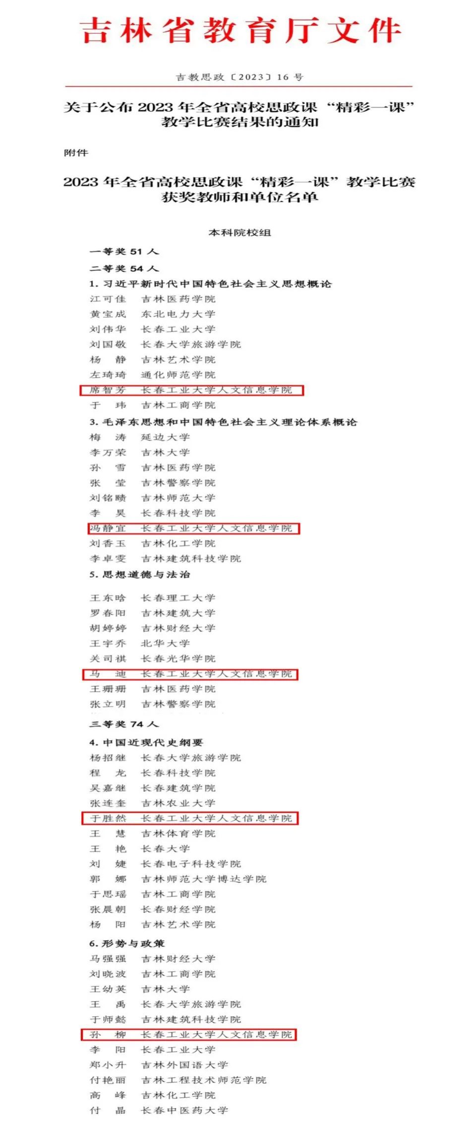 近日,为深入学习贯彻党的二十大精神,贯彻落实《关于深化新时代学校思想政治理论课改革创新的若干意见》,全面推进“大思政课”建设,持续提升高校思政课教师教学水平,省教育厅组织开展了2023年全省高校思政课“精彩一课”教学比赛。长春工业大学人文信息学院马克思主义学院席智芳、马迪、冯静宜三名教师荣获二等奖,于胜然、孙柳两名教师荣获三等奖。