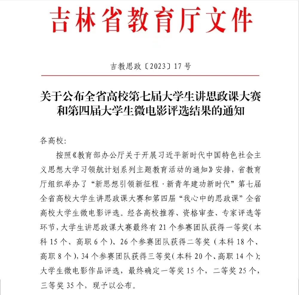 今年710月,按照《教育部办公厅关于开展习近平新时代中国特色社会主义思想大学习领航计划系列主题教育活动的通知》安排,吉林省教育厅组织举办“新思想引领新征程·新青年建功新时代”第七届全省高校大学生讲思政课大赛和第四届“我心中的思政课”全省高校大学生微电影大赛活动。