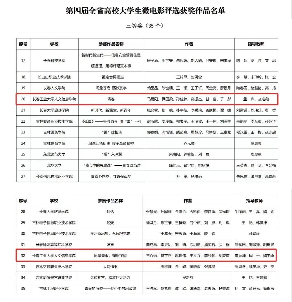 由孟晔、赵唯勋老师指导,校团委新媒体中心学生马晨阳、尹国梁、孙佳伟、高振杰、甘蜜、于彤参与录制的微电影《青春》,由李振坤、周丹、魏宇峥老师指导,管理学院学生王心语、符宇杰、赵世伟、王文卉、李欣航、胡梦暄参与录制的微电影《愿景无限,理想飞翔》获第四届“我心中的思政课”全省高校大学生微电影大赛本科组三等奖。