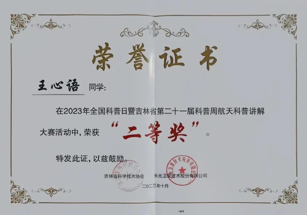 由李振坤老师指导,王心语同学的作品《航天强国,逐梦星辰》荣获全国科普日暨吉林省第二十一届科普周航天科普讲解大赛大学组二等奖。本次比赛不仅考验了学生的讲解技能,也让我校参赛队伍有机会与其他高校交流,分享感受和经验,这场比赛不仅仅是一场竞技,更是一次高校之间互相学习的聚会。我校学子在赛场上展现出了两强精神,同时也展现了独特魅力。希望在未来的比赛中我校学子继续努力,不断进步!