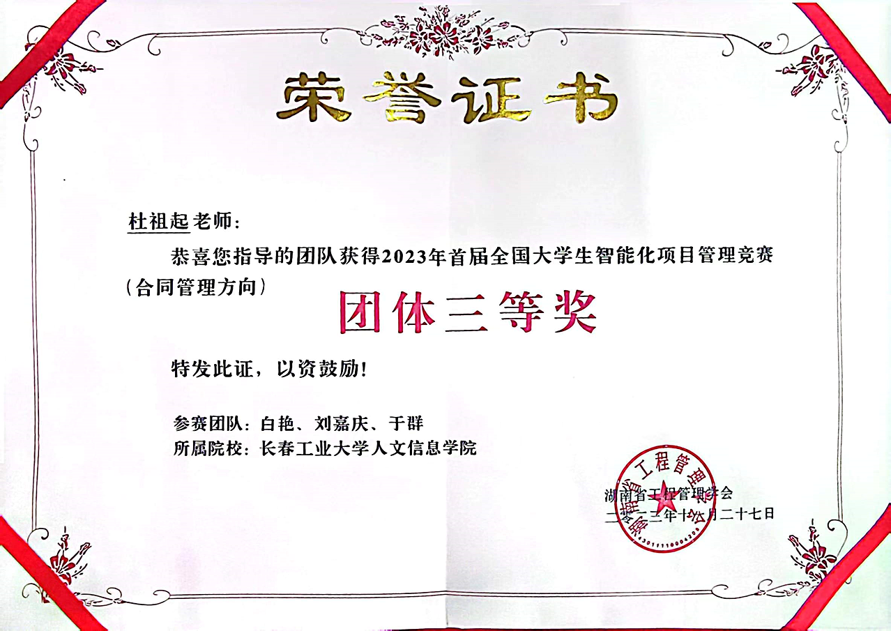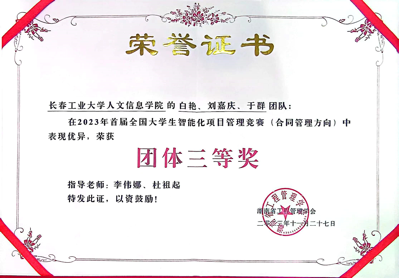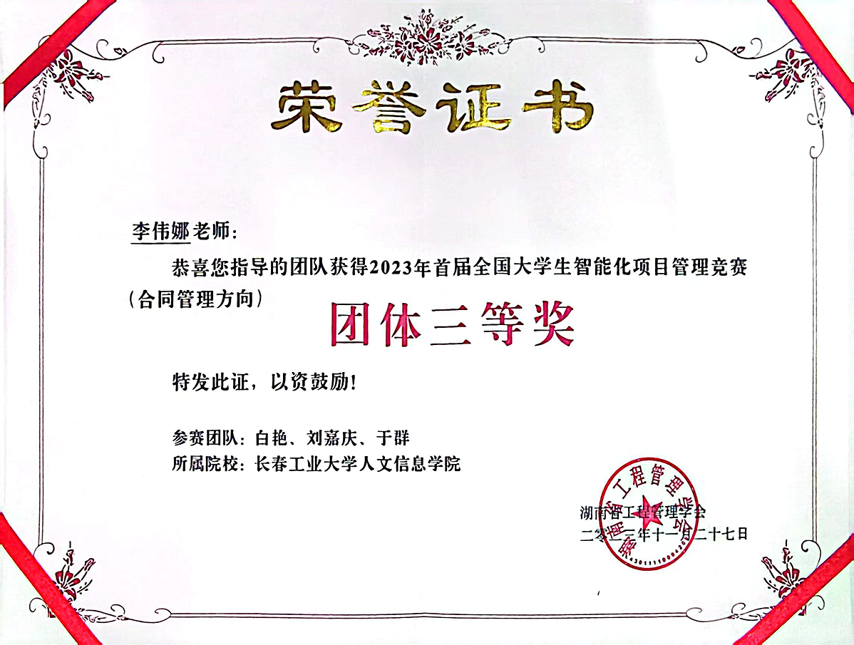 11月25日,由湖南省工程管理学会主办,中南大学土木工程学院承办、长沙计支宝信息科技有限公司协办的首届全国大学生智能化项目管理竞赛在中南大学圆满结束。我校建设工程学院李伟娜老师指导的2021级工程管理专业白艳、刘嘉庆、于群三名同学组成的参赛团队在竞赛中喜获团队三等奖。