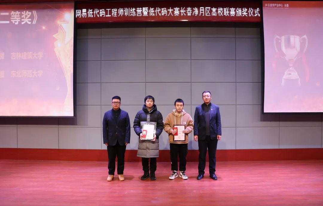为全方位培养数字化转型人才,推动产学研合作一体化,助力区域数字人才梯队建设,打好数字经济产业人才基础。12月22日,网易低代码工程师训练营暨网易低代码大赛“长春·净月区”高校联赛颁奖仪式在我校学术报告厅举行。净月高新技术产业开发区投资促进五局副局长王俊皓,网易长春数字产业中心城市项目总经理刘赫兴,低代码技术专家杨文梁,吉林省深科产业园运营管理有限公司总经理助理单岫生,吉林建筑大学大学生创新创业教育学院院长王岩,吉林外国语大学创新创业学院副院长王乙,东北师范大学信息科学与技术学院贾保龙老师,长春工业大学人文信息学院计算机科学与工程学院院长吴琼,副院长、党总支书记王增宝,团委书记刘莹,2020级辅导员霍瑞凇及学院学生代表参加了本次颁奖仪式。