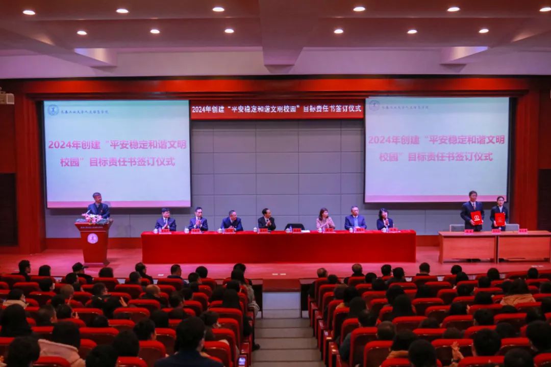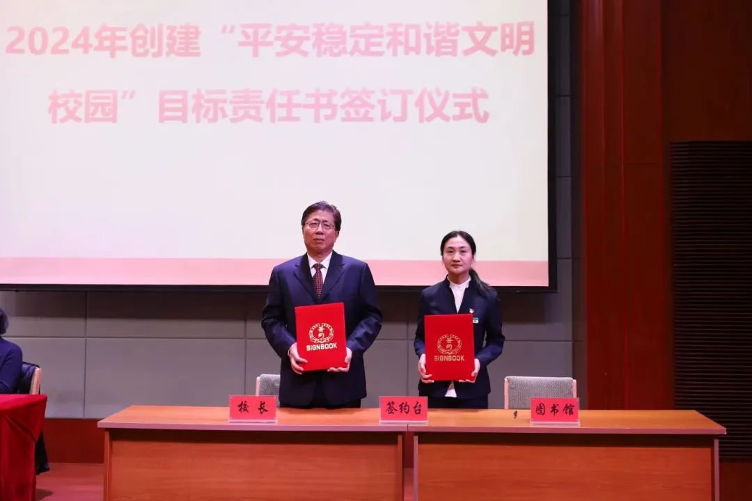 仪式现场,校长潘福林代表学校与图书馆、电气与电子工程学院分别签订2024年创建“平安稳定和谐文明校园”目标责任书。