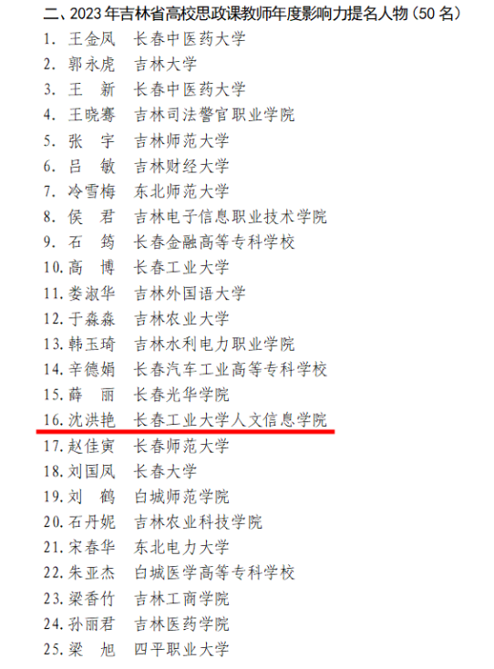 近日,吉林省教育厅发布公告,根据《关于开展2023年吉林省高校思政课教师年度影响力人物推选展示活动的通知》,经学校推荐、专家评审,评选出“2023年吉林省高校思政课教师年度影响力人物”20人和“2023年吉林省高校思政课教师年度影响力提名人物”50人。我校教师沈洪艳被评为“2023年吉林省高校思政课教师年度影响力提名人物”。